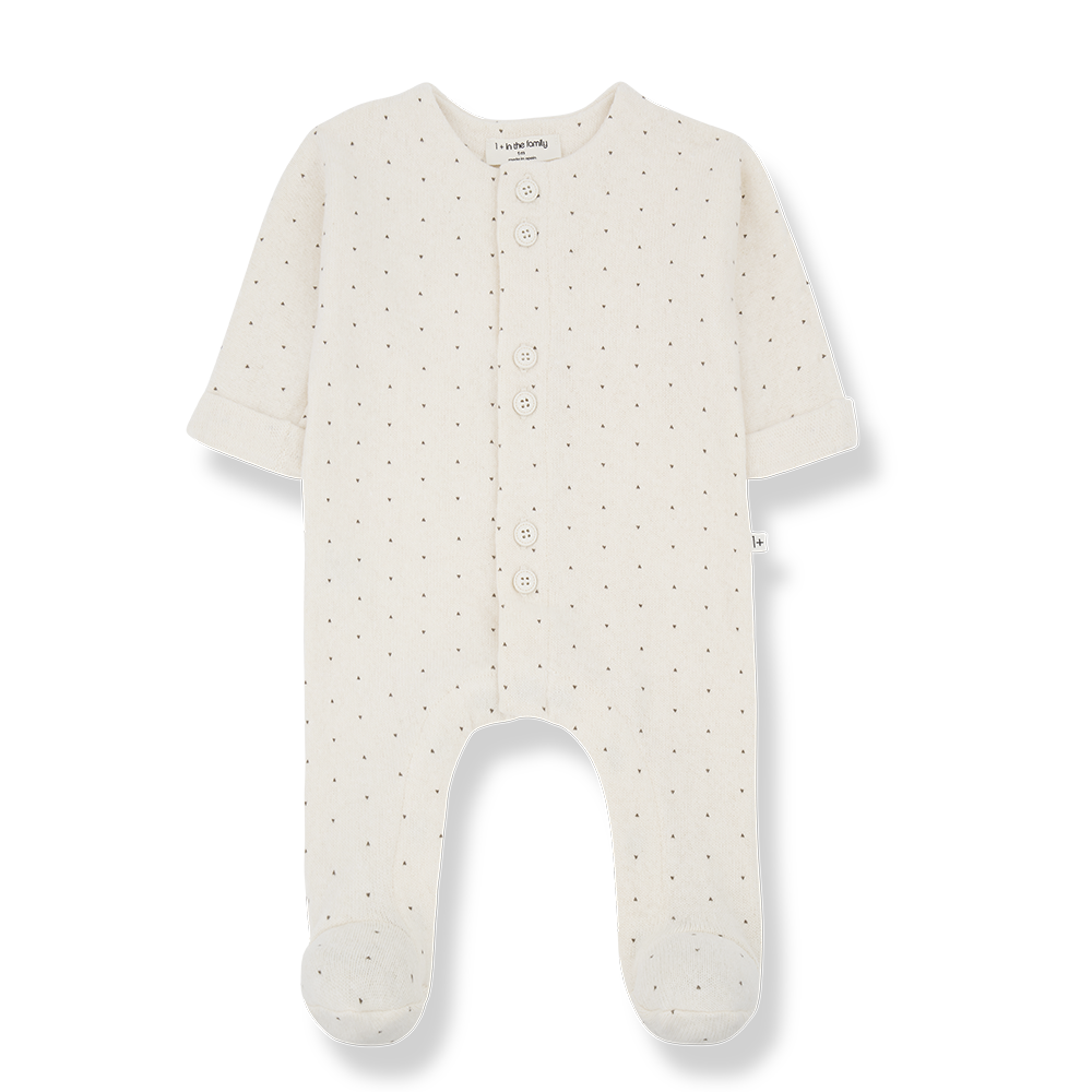 Prachtig ecru newborn pakje van 1+ in the family met voetjes van organic cotton fleece in een fijn stippeltje. Het unisex model heeft houten knoopjes aan de voorkant. Lees meer