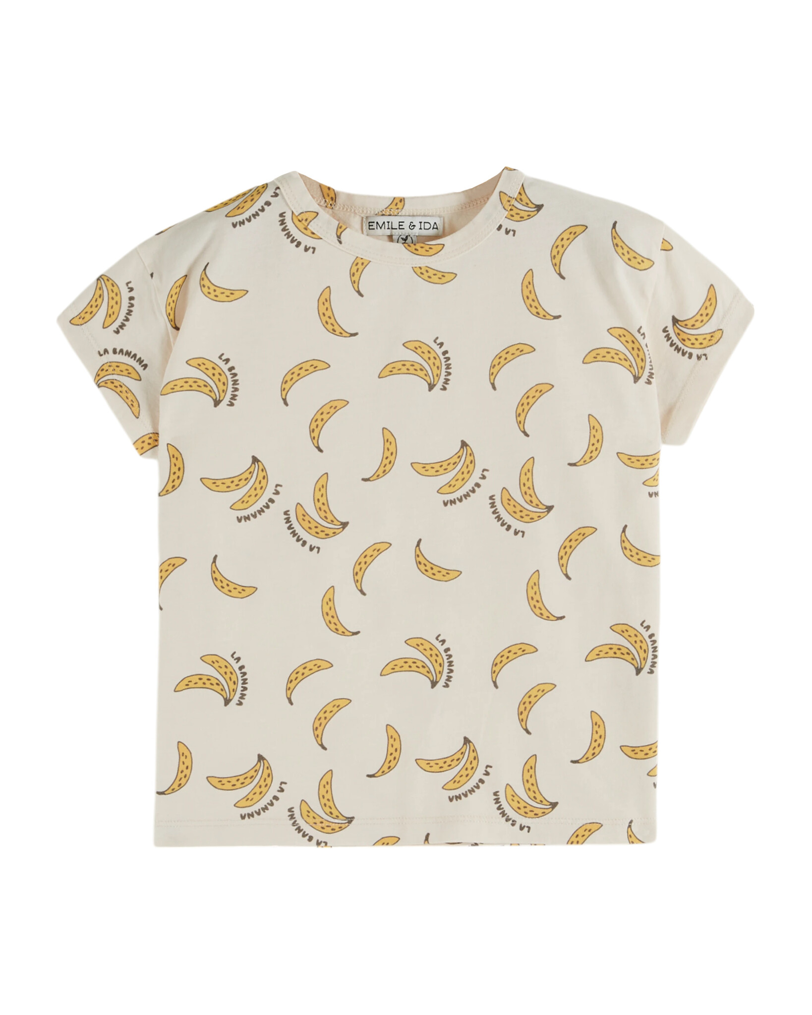Zacht t-shirt van Emile et ida in een lichte crème kleur met bananen print. Het model heeft een ronde halslijn en is gemaakt van een fijne organic cotton. Lees meer