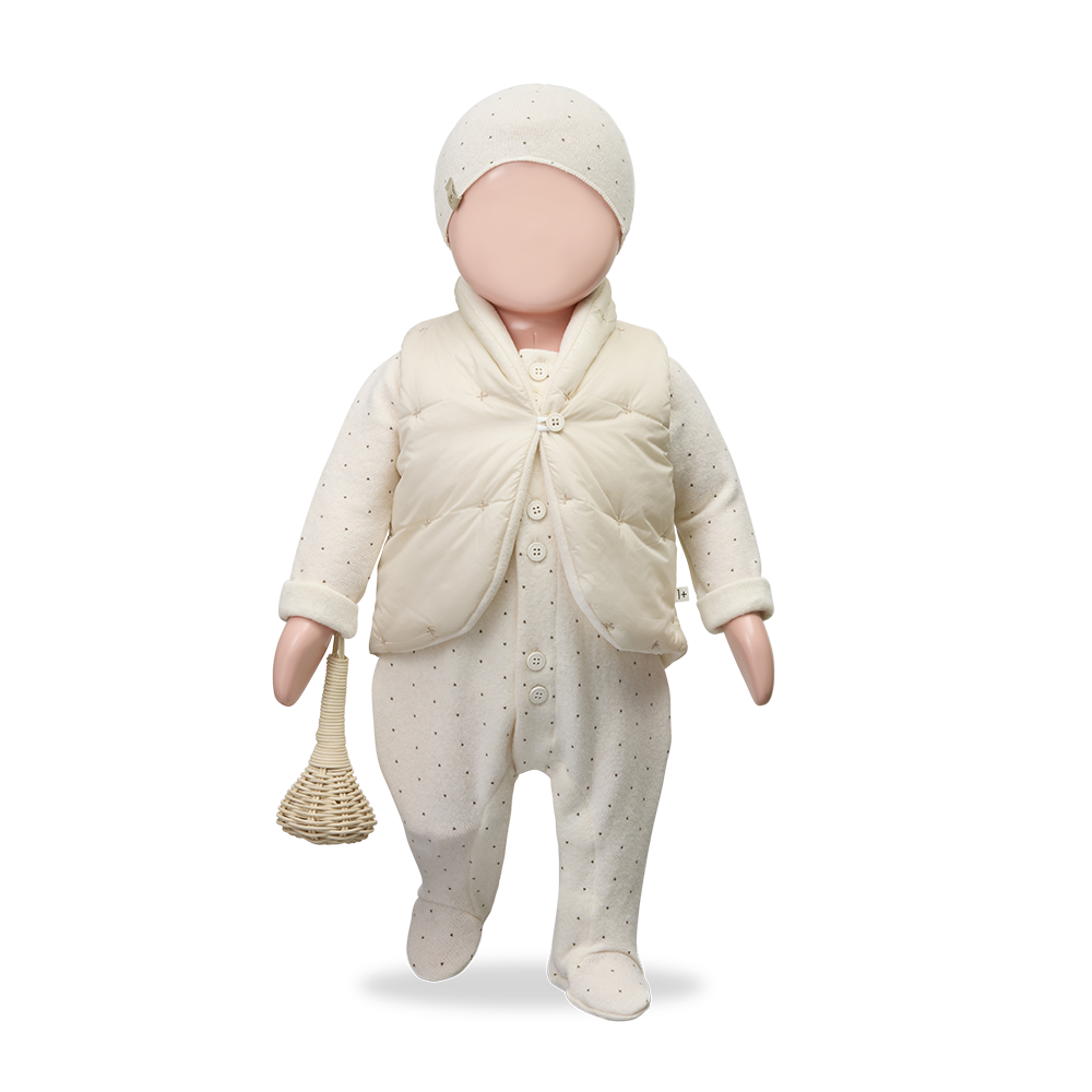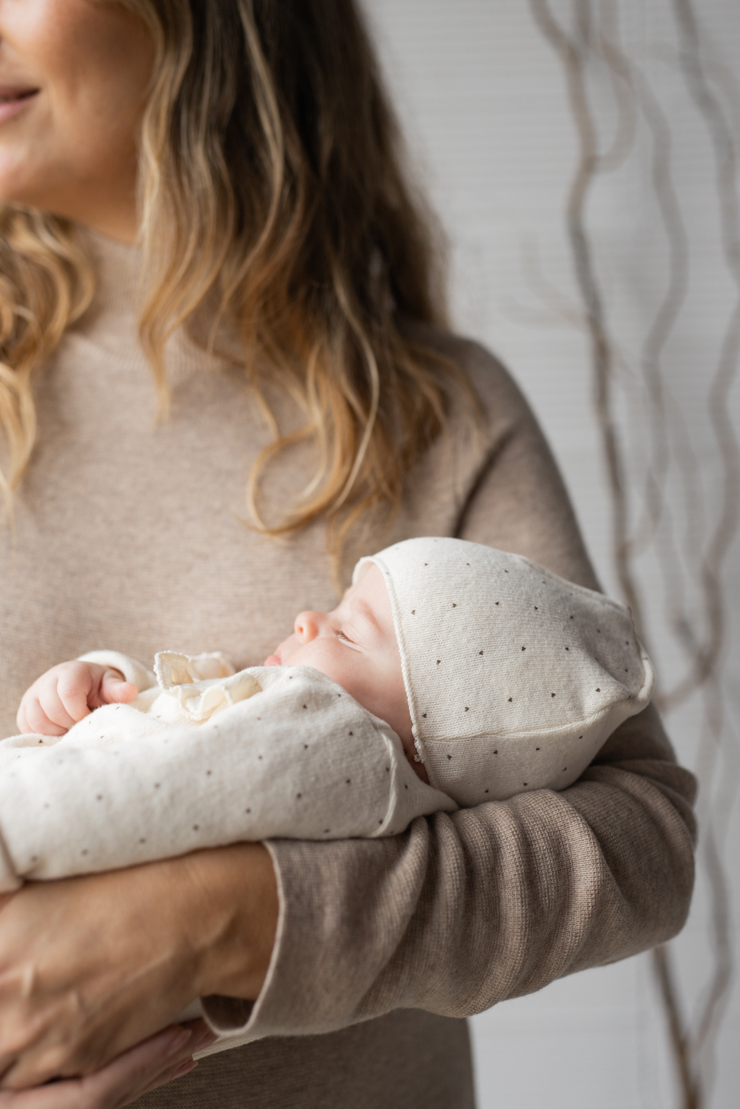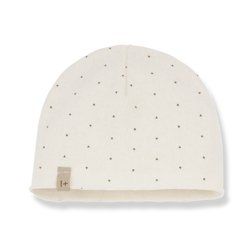 Prachtig ecru newborn mutsje van 1+ in the family van organic cotton fleece met een fijn stipje. One more in the family valt iets kleiner dan normaal. Zie onderaan de pagina een overzicht van de maten.