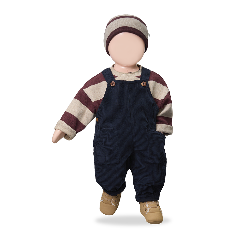 Donker blauw pakje van 1+ in the family in een zachte rib structuur. Het mouwloze pakje heeft decoratieve zakjes aan de voorkant. One more in the family valt iets kleiner dan normaal. Zie onderaan de pagina een overzicht van de maten.