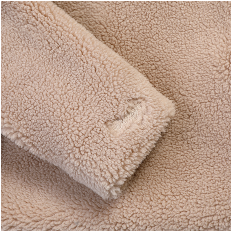 Een te gek baby jasje van Donsje met een lief kraagje en geborduurde konijntjes. Het fluffy jasje is uitgevoerd in een zandkleurig schapen vachtje, heeft een knoopsluiting aan de voorkant en decoratieve zakjes. Lees meer