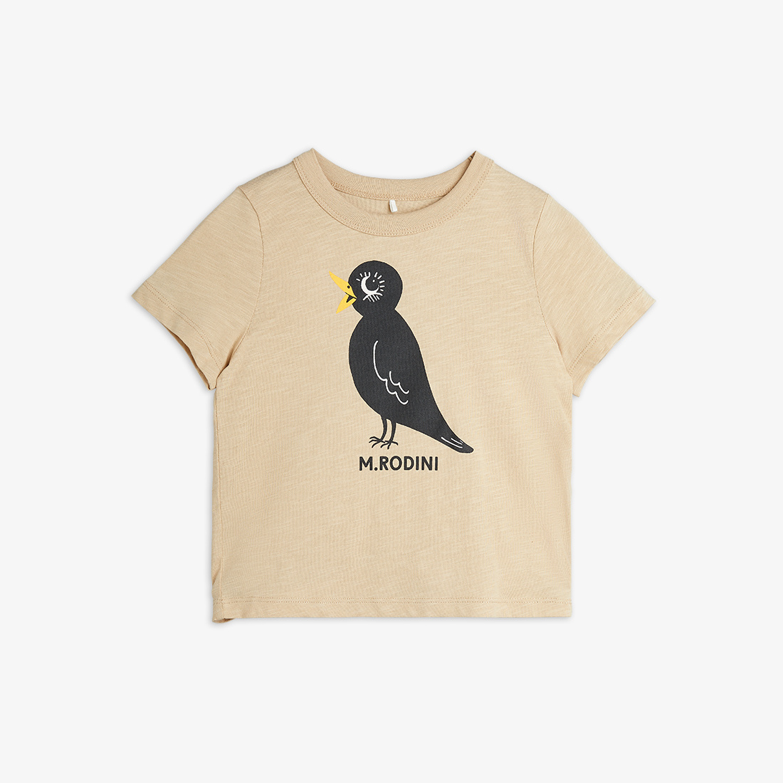 Beige t-shirt van Mini Rodini met black bird opdruk. Het shirt heeft een rechte pasvorm, korte mouwen en een ronde geribbelde hals. Hij is gemaakt van 100% GOTS gecertificeerd organic cotton. Lees meer