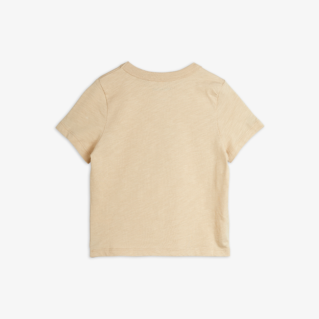 Beige t-shirt van Mini Rodini met een blackbird opdruk aan de voorkant. Het shirt heeft korte mouwen, een rechte pasvorm en een ronde geribbelde hals. Het merk valt redelijk normaal tot wat groter, zie onderaan de pagina voor een overzicht van de maten.