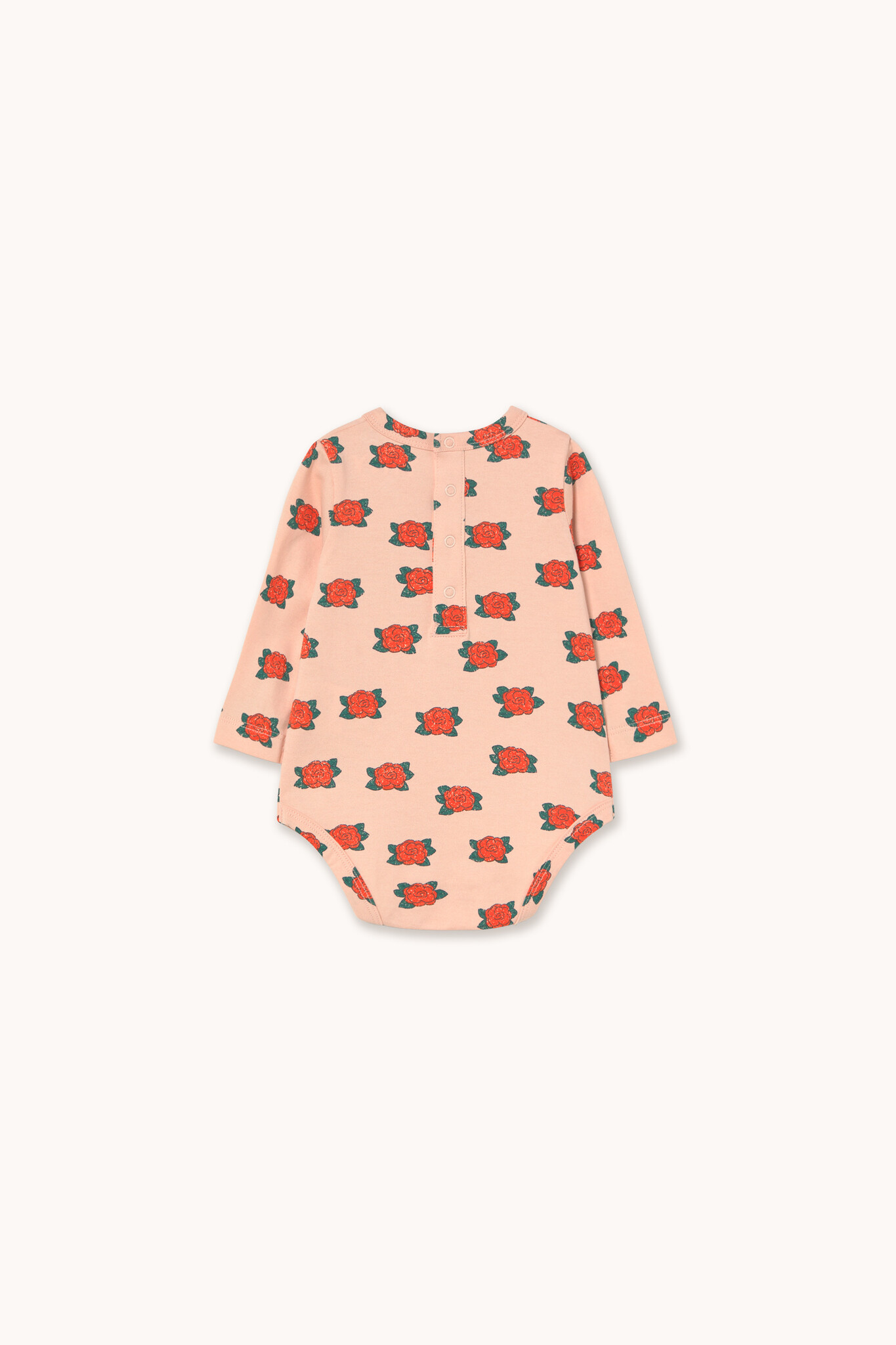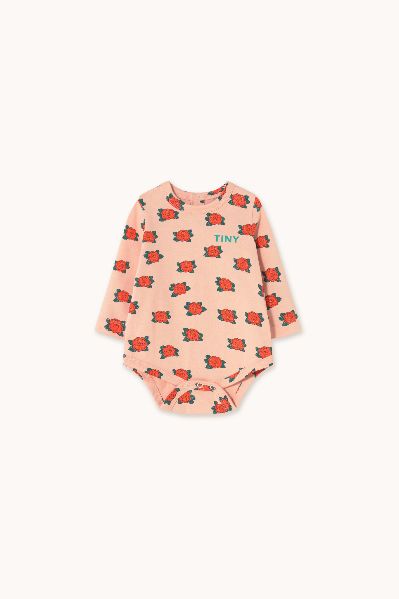 Vrolijke licht roze romper van Tinycottons met een all-over bloemen print. De body met lange mouwen heeft een ronde hals, heeft handige druk knoopjes en is gemaakt van organic cotton.