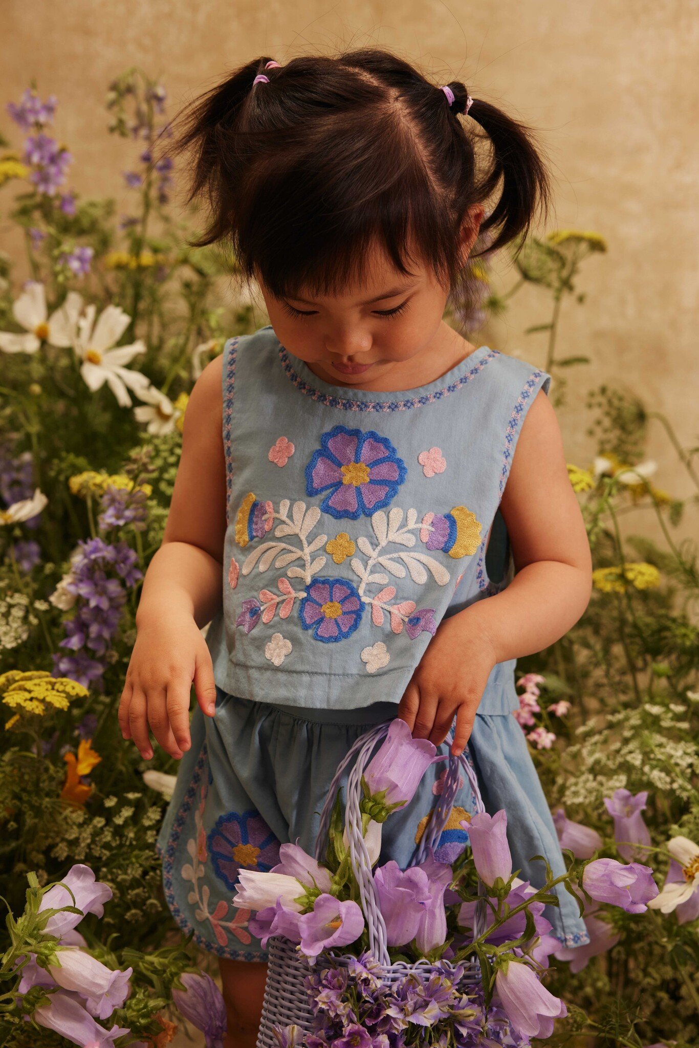 Blauwe top van Louise Misha met kleurrijke borduursels. Het korte model heeft een gekruist rug detail met een subtiele sluiting. Er is ook een bijpassende short en hij is gemaakt van organic cotton. Lees meer