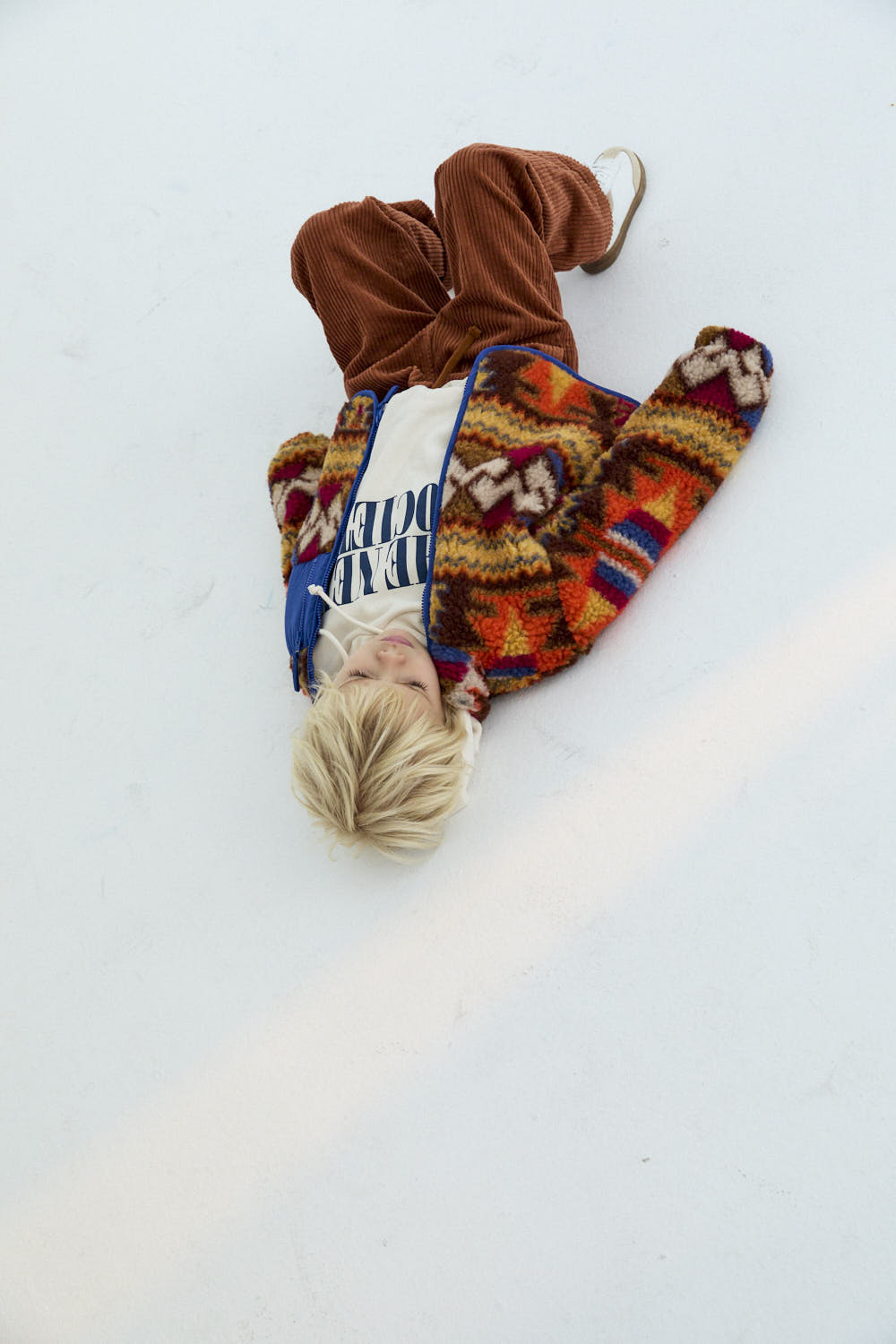 De AW25 wintercollectie van The New Society, getiteld 'Nowhere', neemt je mee op reis door de uitgestrekte en stille landschappen van IJsland. Het Spaanse merk laat zich inspireren door de ruige schoonheid van dit land. De collectie staat in het teken van zelfontdekking en verbinding met het onbekende. Warme aardetinten en koele ijskleuren worden afgewisseld met levendige accenten als oranje en robijnrood. Rijke texturen zoals dikke wol, grove breisels en gerecyclede stoffen versterken de link met ambacht en natuur. Er zijn borduursels van sterren, maanlandschappen en Noordse symbolen. De silhouetten zijn oversized en gelaagd, ontworpen voor comfort en bescherming.