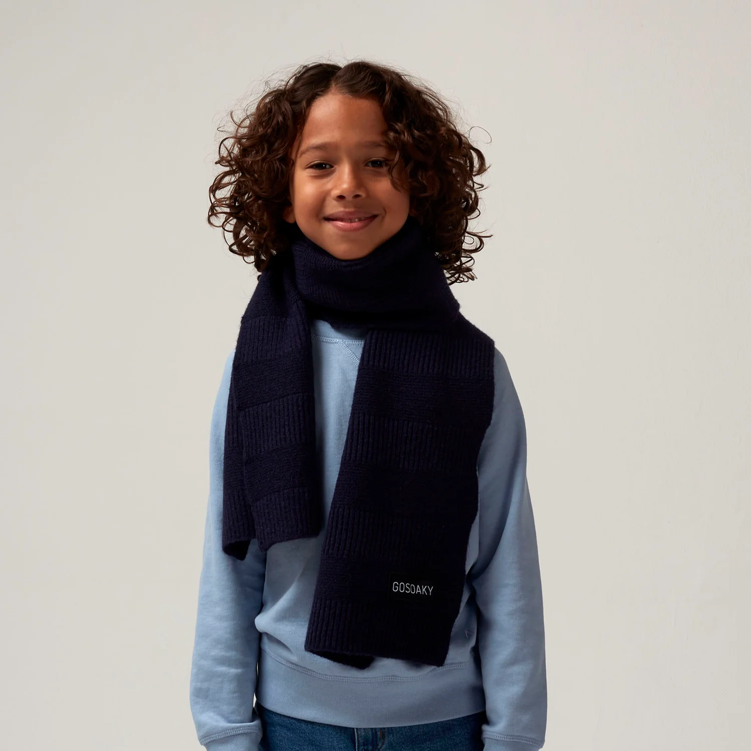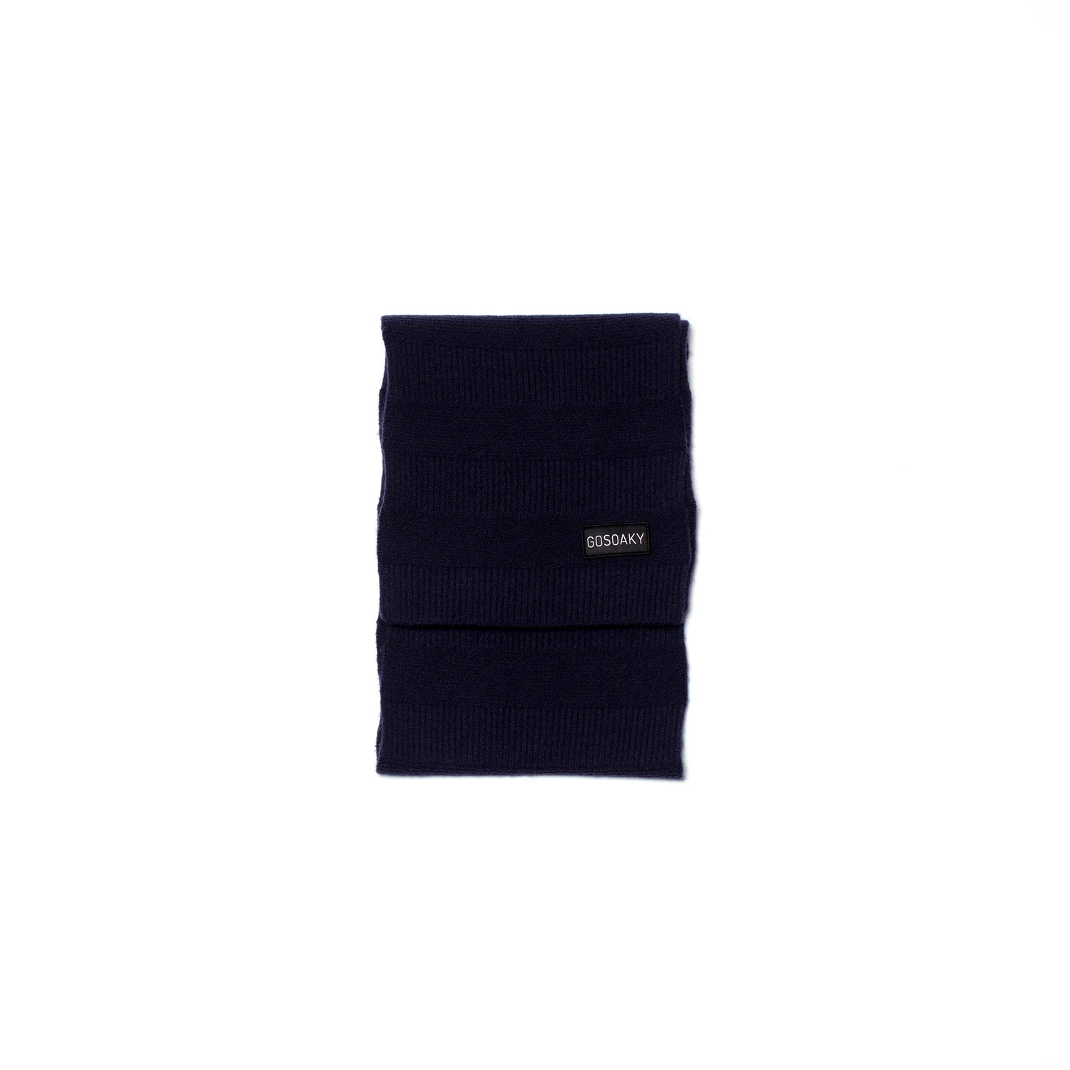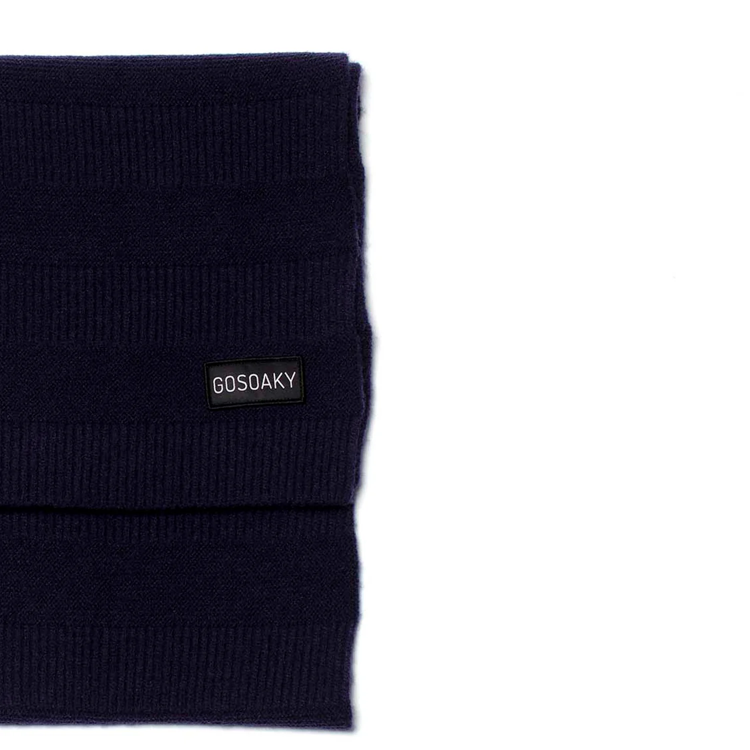 Grof gebreide sjaal in donker blauwe kleur van GOSOAKY met logo embleem. Lees meer