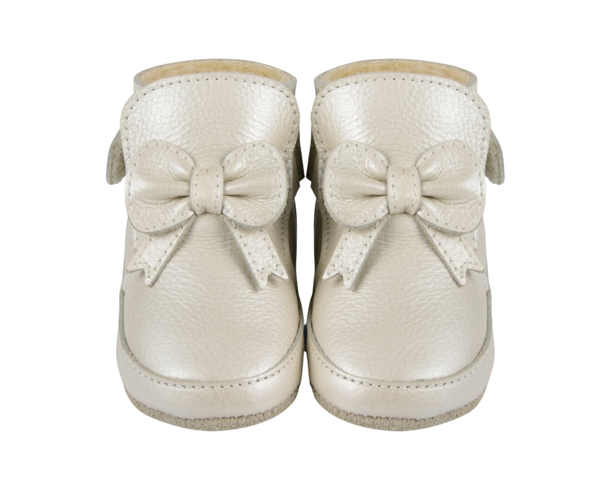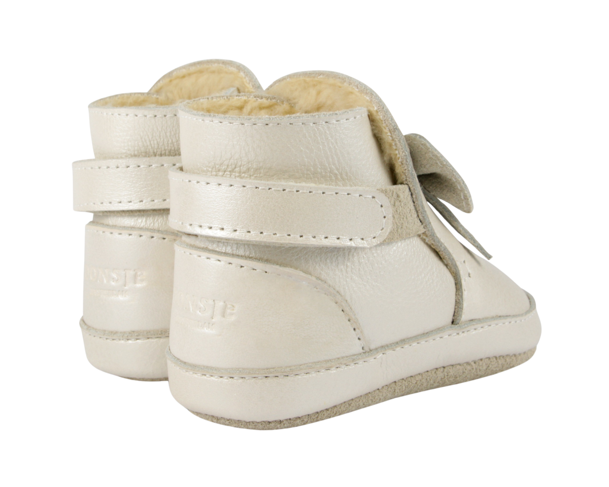 Gevoerd leren baby schoentje van Donsje in prachtig off white metallic met strik detail. Het warme schoentje heeft een handige klittenband sluiting. Ook leuk als (kraam) cadeau!