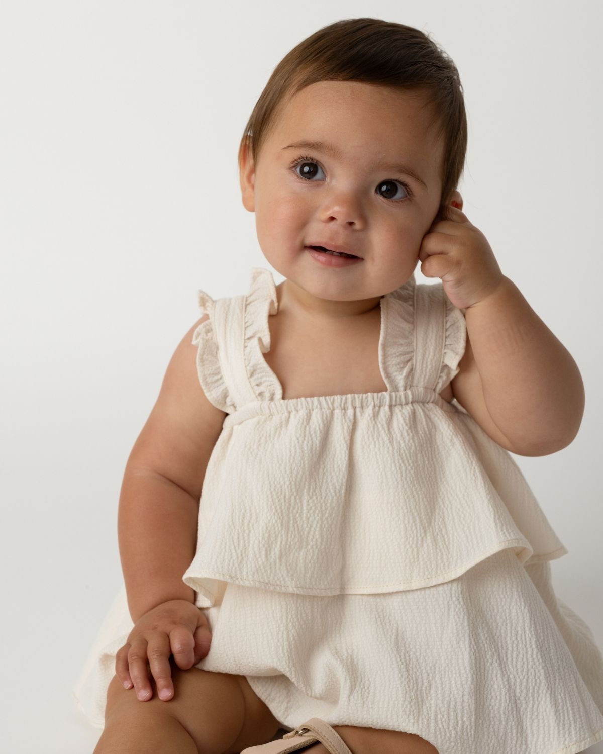 Elegant baby pakje van Donsje in gebroken wit. Het volumineuze model heeft prachtige ruffle laagjes, een elastische opening bij de benen en borst en een handige sluiting bij het kruis. Donsje valt normaal op maat tot iets groter, zie onderaan de pagina een overzicht van de maten.