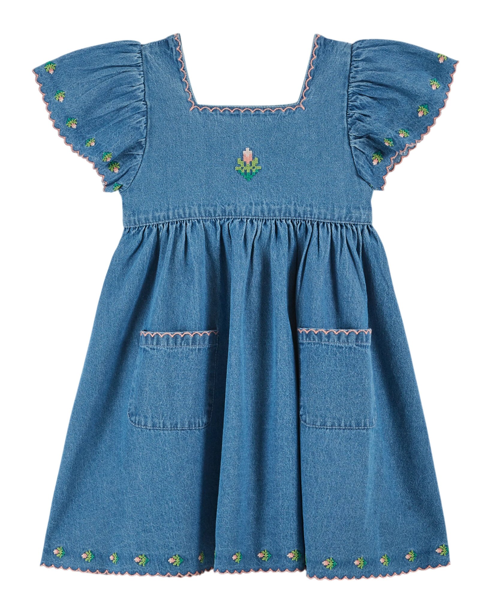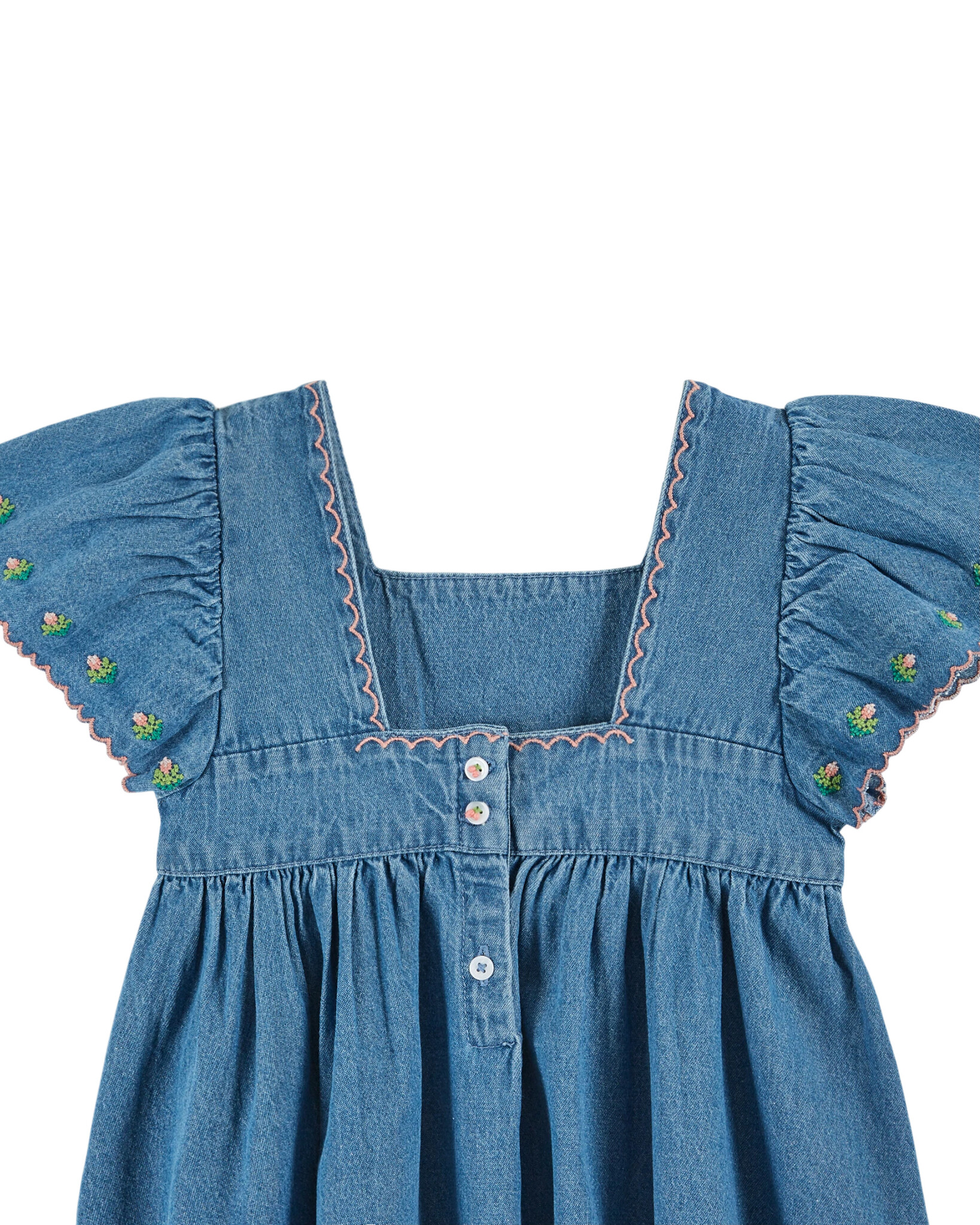 Te gek denim jurkje van Emile et ida met elegante details. Het korte uitlopende model heeft geschulpte details, een vierkanten halslijn, geborduurde bloemetjes en knoopjes op de rug. Een uniek item voor de zomer in organic cotton. Lees meer