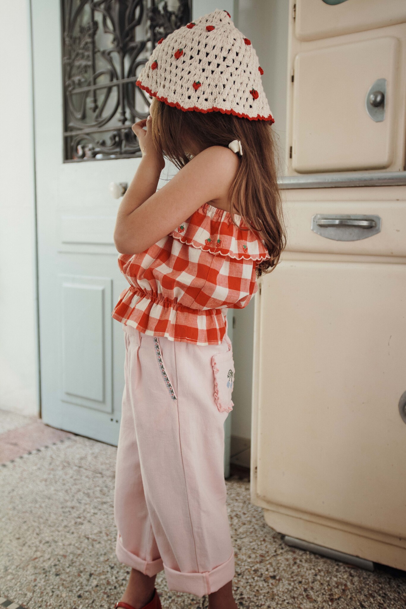 Geweldige top van Emile et ida in een rode ruit. Het unieke model heeft gesmokte details, dunne bandjes en geborduurde aardbeitjes. Steel de show met deze zomerse top in organic cotton. Het merk Emile valt iets kleiner dan normaal, zie onderaan de pagina voor een overzicht van de maten.