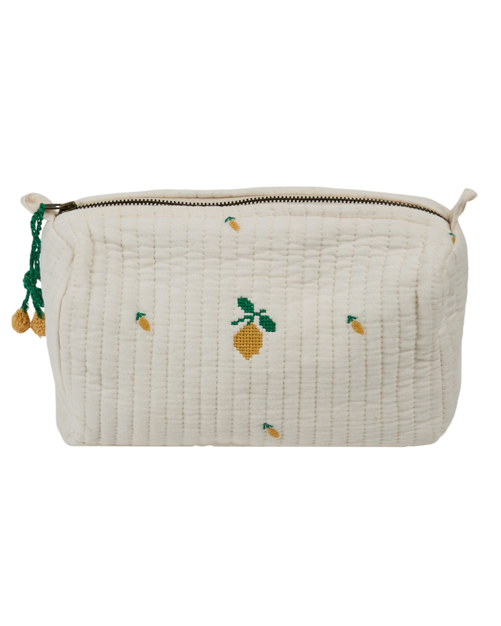 Zachte toilettas van Emile et ida met citroenen opdruk. Het tasje heeft een water afstotende voering en handige vakjes. De ritssluiting is voorzien van een geborduurde hanger. Hij is gemaakt van organic cotton. Afmeting: 24 x 15 x 10 cm.