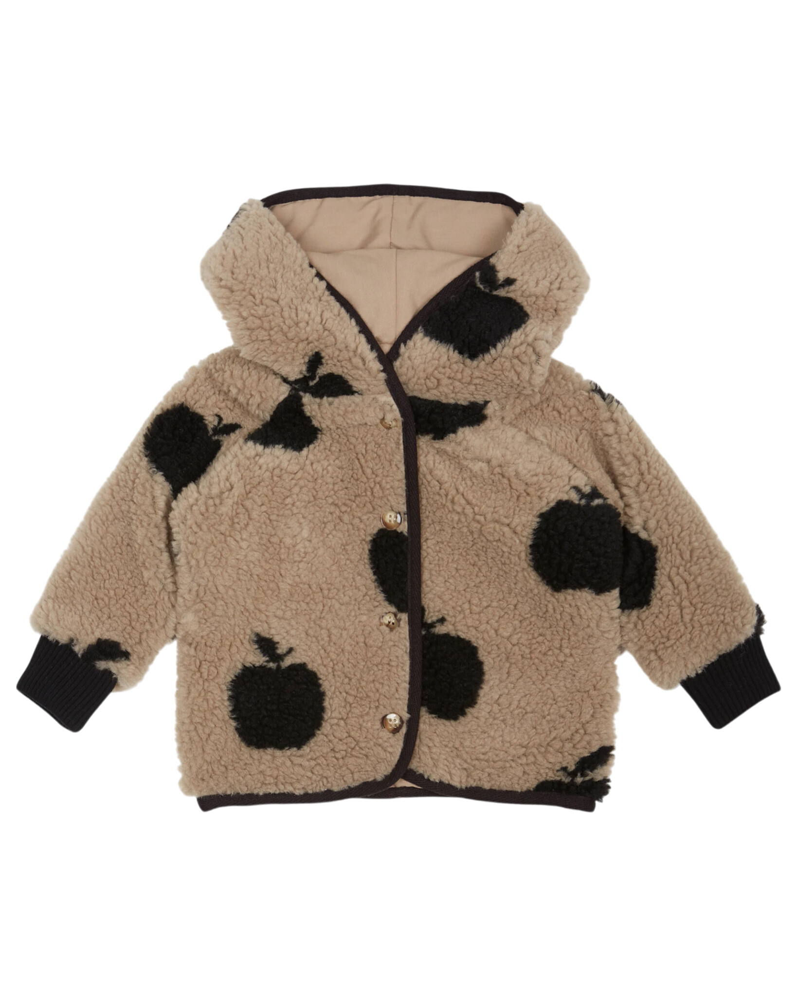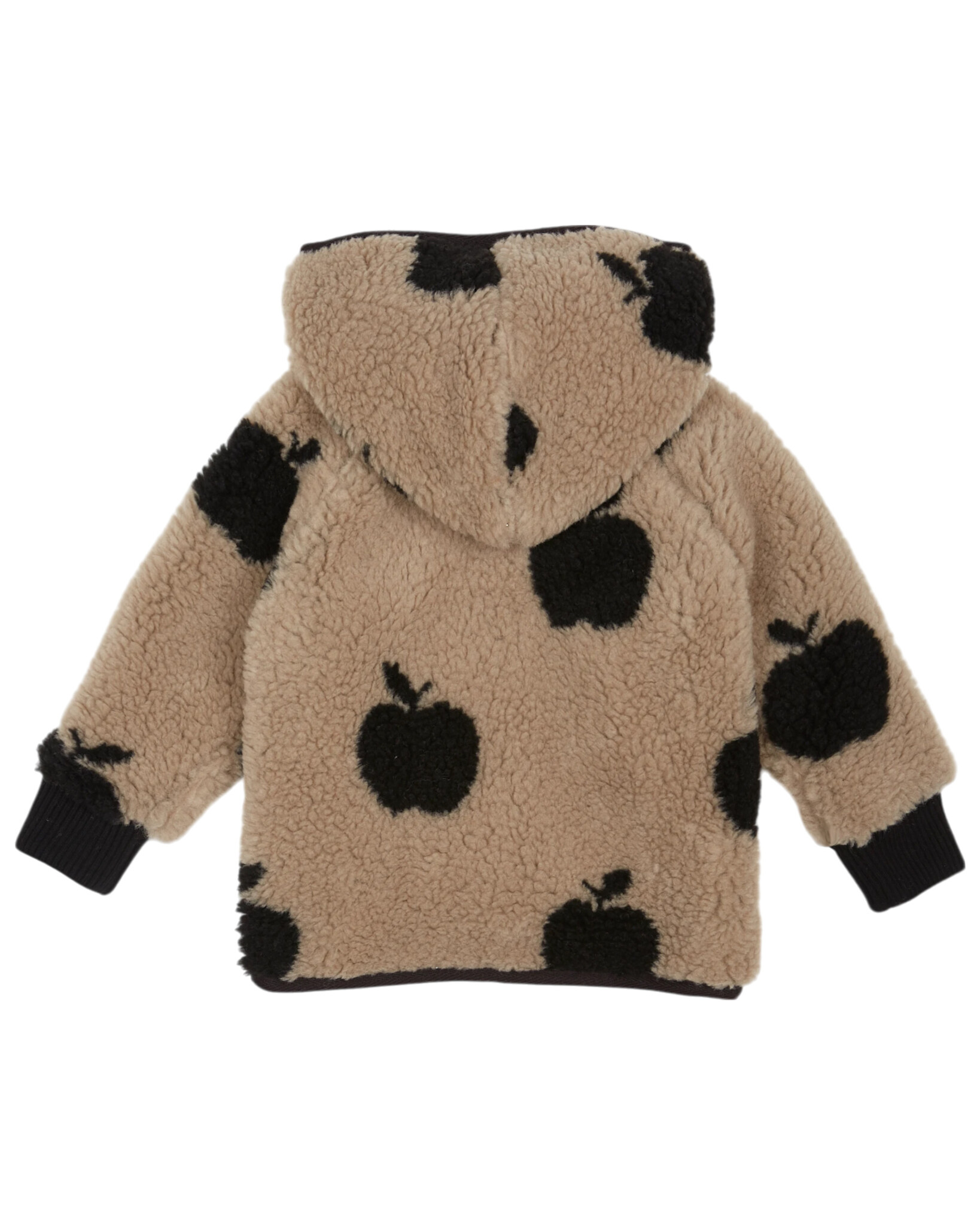 Zacht bruin baby jasje van Emile et Ida met een all over appeltjes print. Hij is gemaakt van een zacht imitatie bontje en heeft een katoenen voering. Het jasje is uitgevoerd met een capuchon, geribbelde boorden en een knoopsluiting. Lees meer