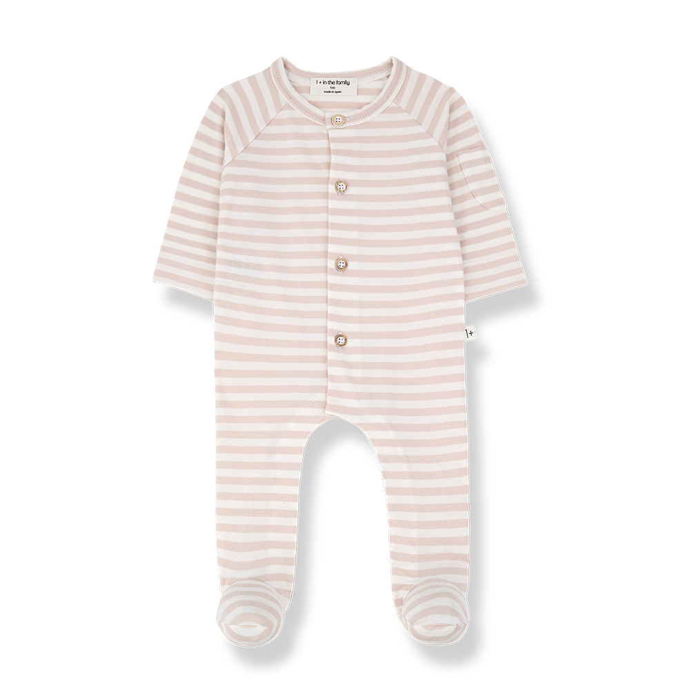 Prachtig zacht newborn pakje van 1+ in the family in een licht roze streep. Het model heeft houten knoopjes aan de voorkant en een handige drukknoop sluiting aan de onderkant. Hij is gemaakt van duurzaam materiaal. Lees meer