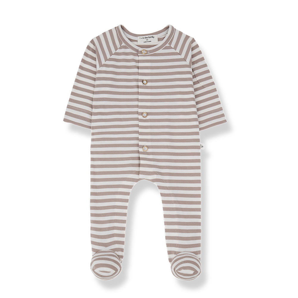 Prachtig zacht newborn pakje van 1+ in the family in een licht bruine streep. Het model heeft houten knoopjes aan de voorkant en een handige drukknoop sluiting aan de onderkant. Hij is gemaakt van duurzaam materiaal. Lees meer
