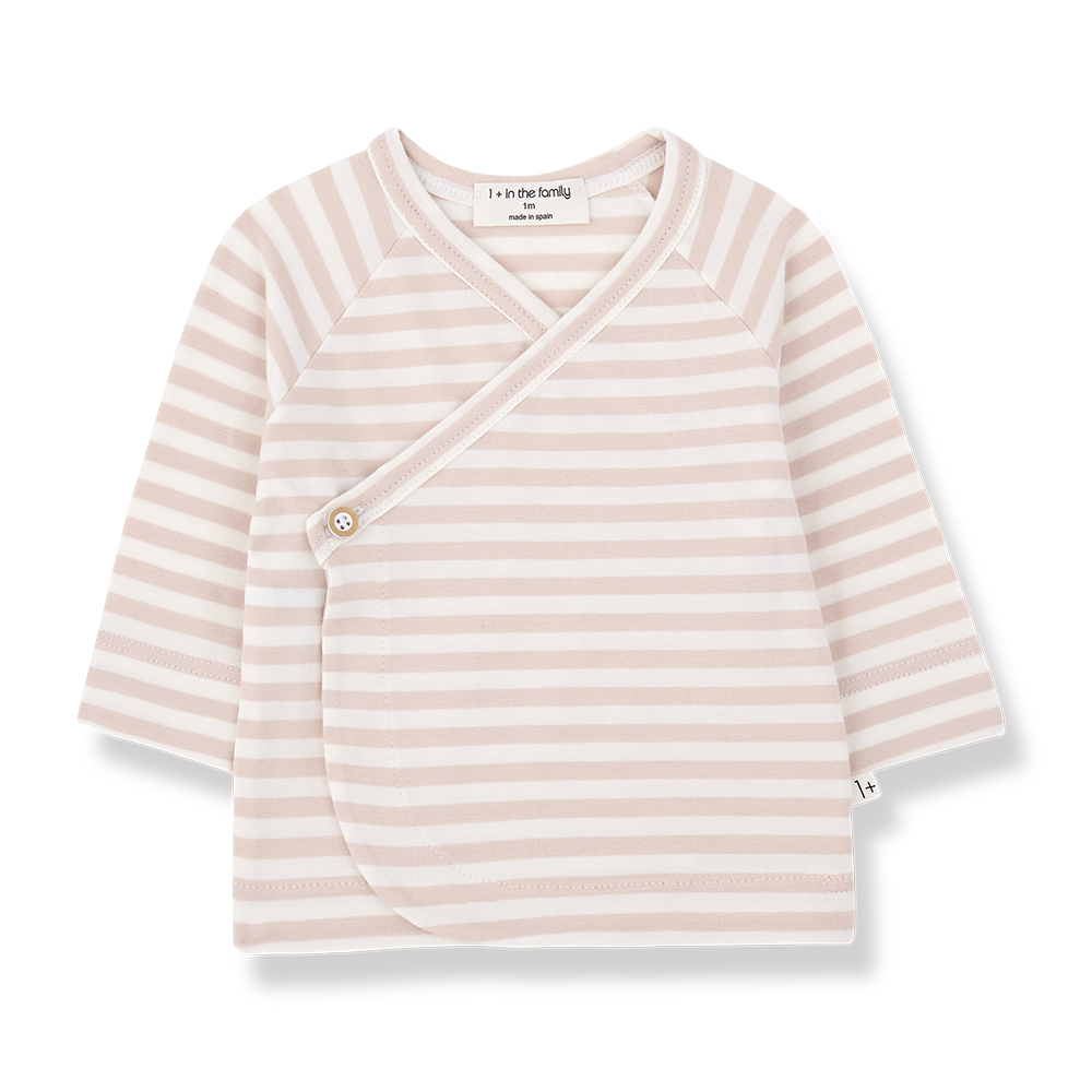 Zacht overslag topje van 1 + in the family in een prachtige licht roze streep. Het newborn shirtje heeft een v-hals en een houten knoopje aan de voorkant. Hij is gemaakt van duurzaam materiaal. Lees meer