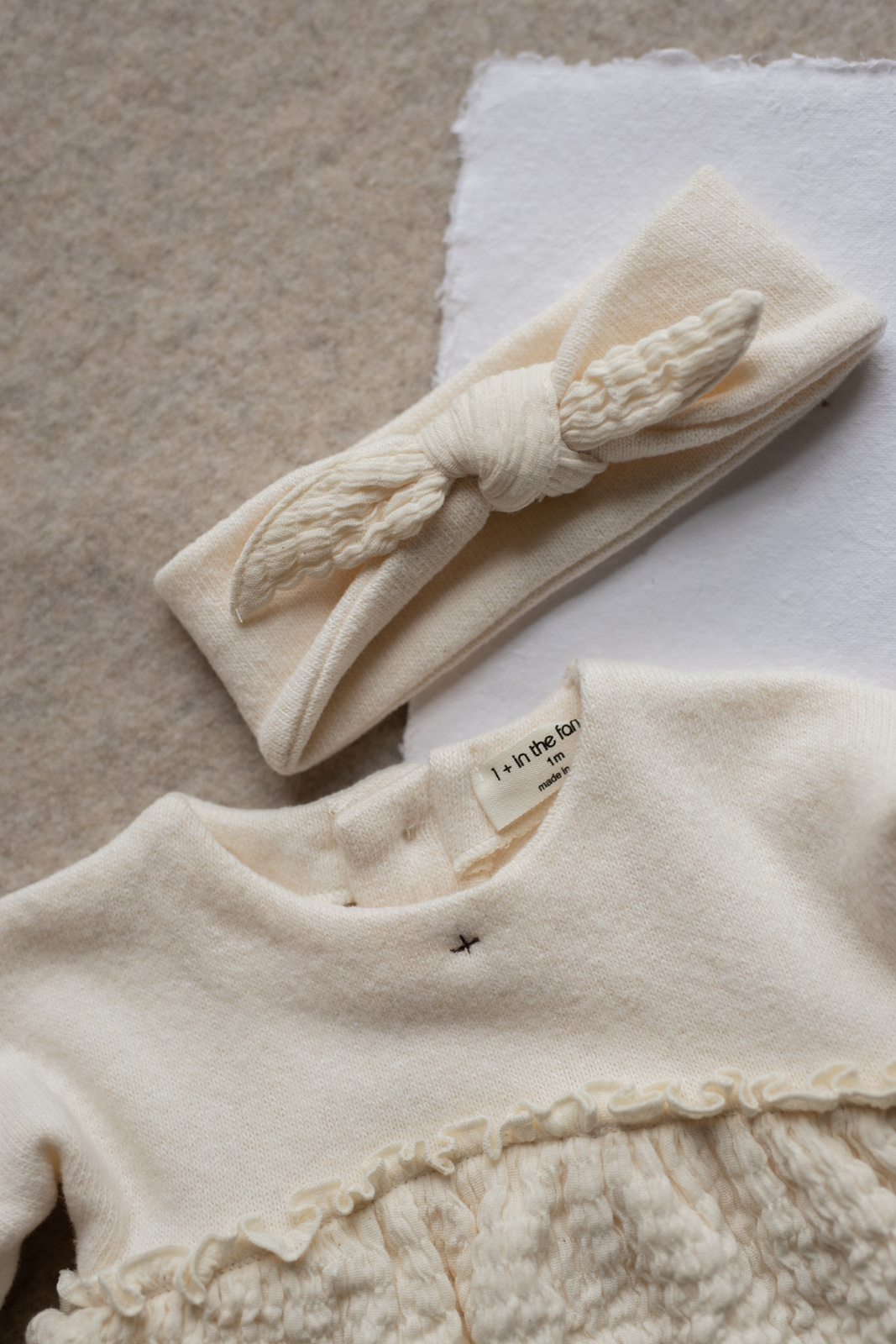 Zachte baby haarband in een prachtige ecru kleur met een knoop detail van 1 + in the family. Lees meer