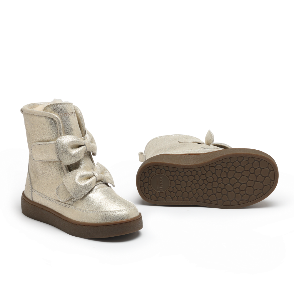 Prachtige winterboots van Donsje met elegante strik details in zilver metallic leer. De laarsjes zijn gevoerd met een ultra zacht schapen vachtje en hebben een handige klittenband sluiting.