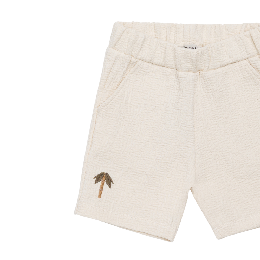 Korte lichte broek in een prachtige katoenen wafel stof van Donsje met een palmboom opdruk. De short heeft een elastische taille en heeft zakjes aan de zijkant. Er is ook een bijpassend t-shirt! Donsje valt normaal op maat tot iets groter, zie onderaan de pagina een overzicht van de maten.
