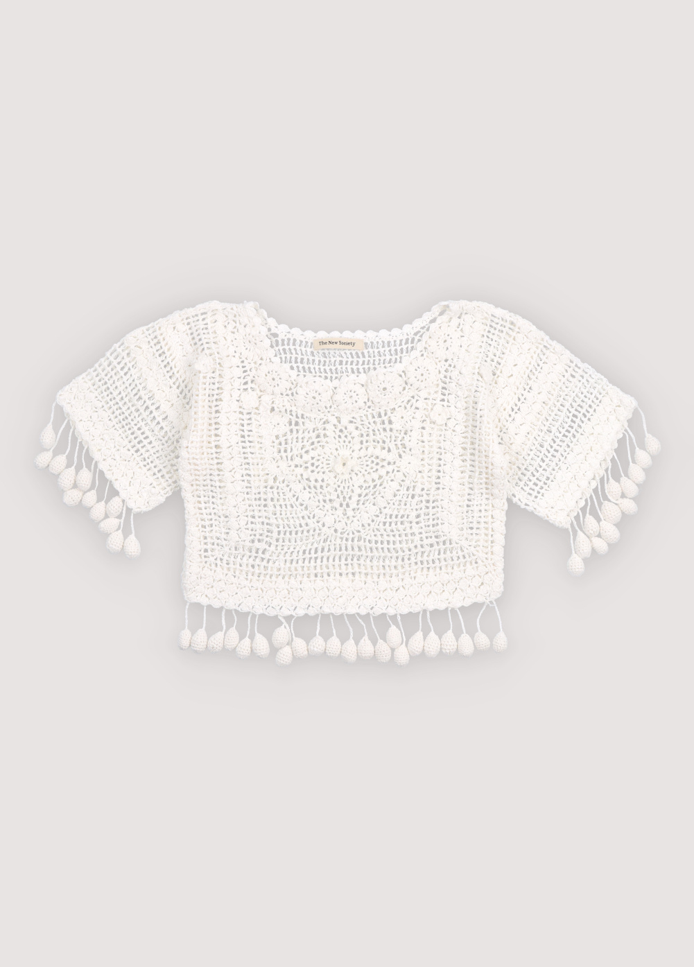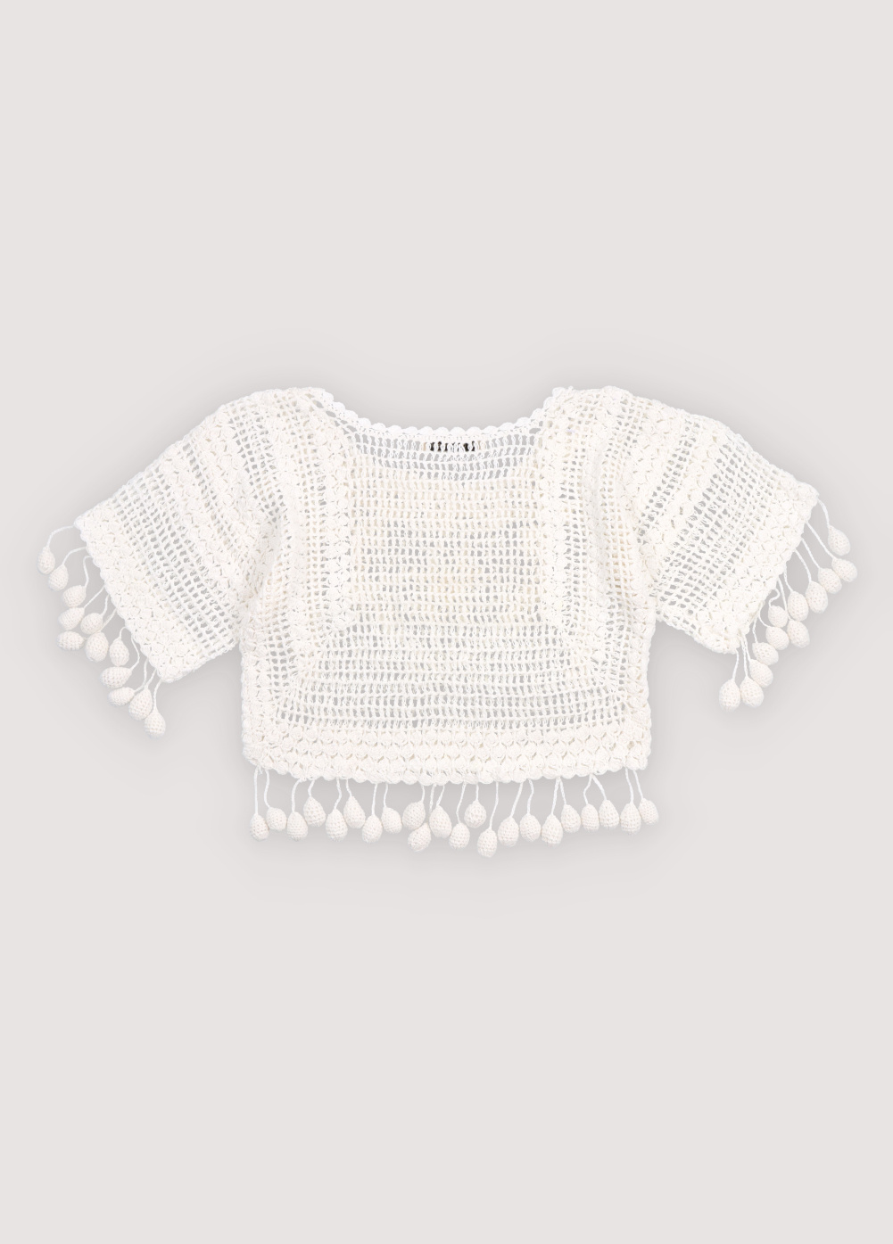 Prachtige bohemian gehaakte top van The New Society met pompom details. Het korte handgemaakt model heeft een ronde hals en is een uniek item voor in de zomer gardarobe. Hij is gemaakt van organic cotton. Lees meer