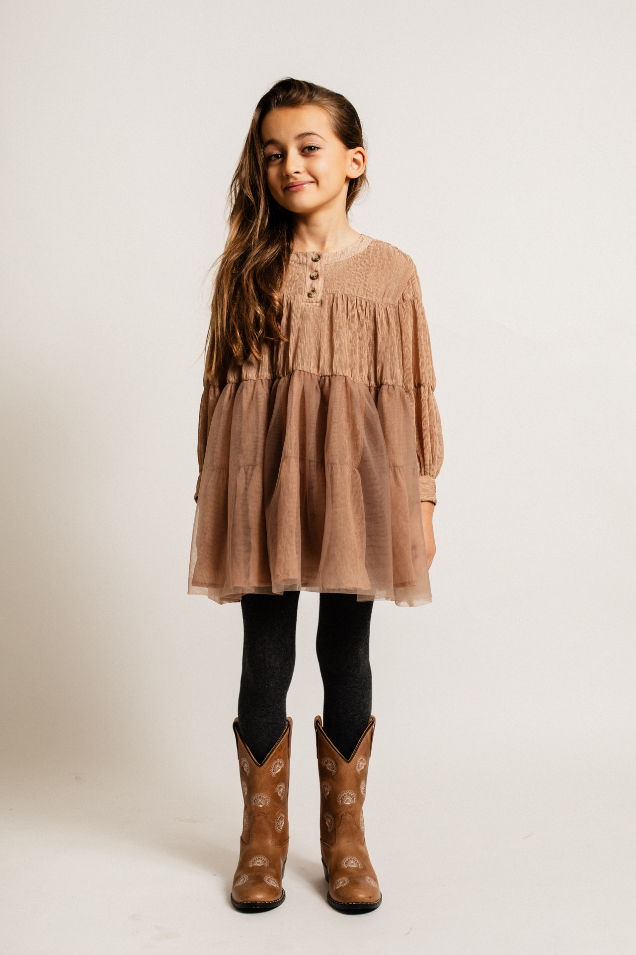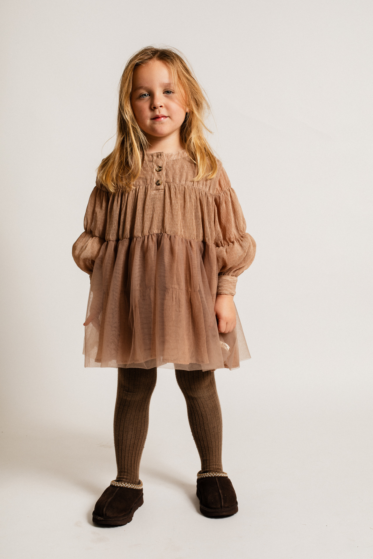 Feestelijke jurk met lange mouwen van Baje Studio in een warme bruine kleur. Het uitlopende model heeft een wijde pasvorm, een ronde hals met knoopjes en is uitgevoerd in verschillende laagjes. Alle items van Baje Studio zijn perfect met elkaar te matchen. Het merk valt normaal op maat, zie onderaan de pagina voor een overzicht van de maten.