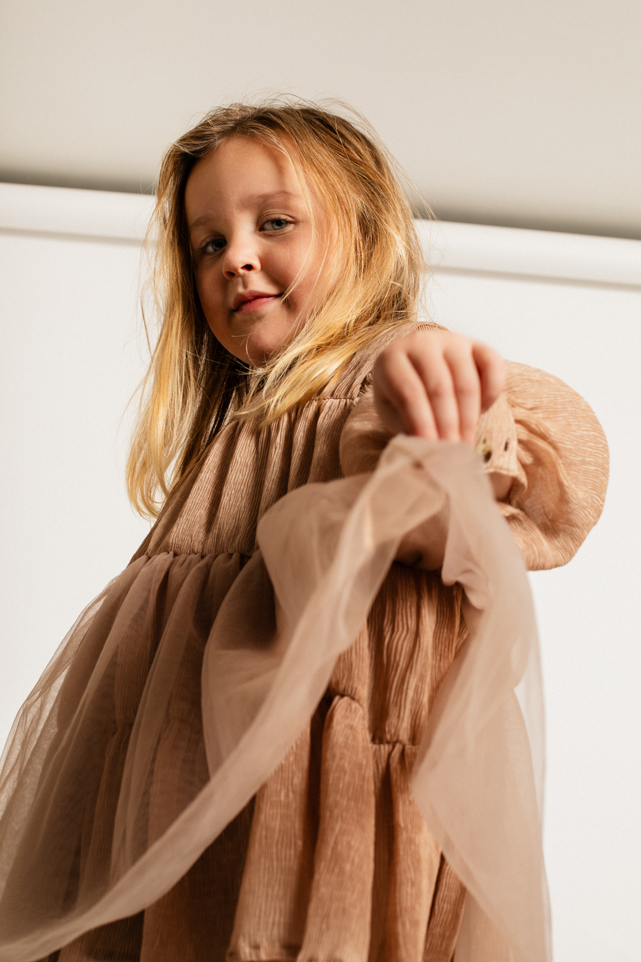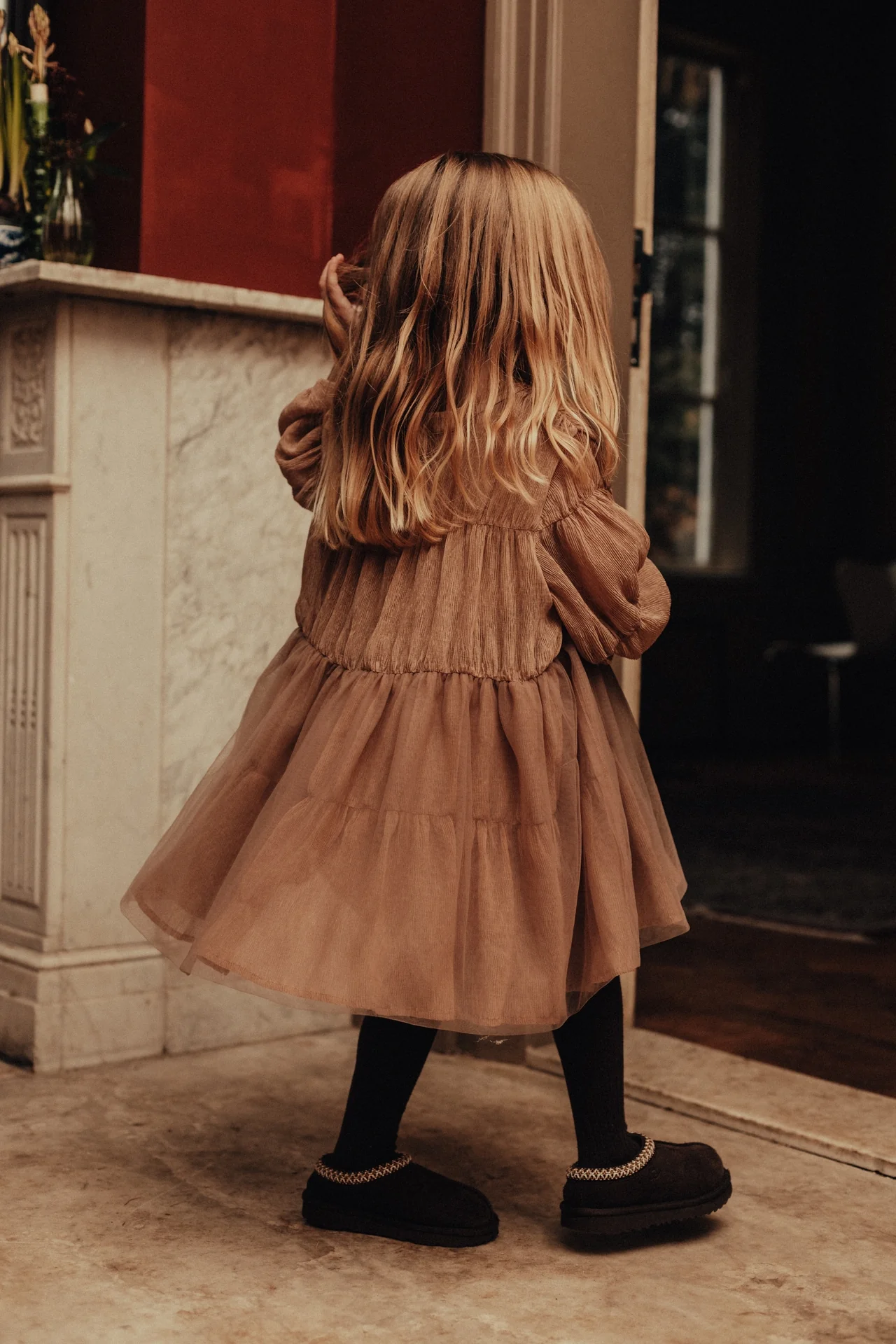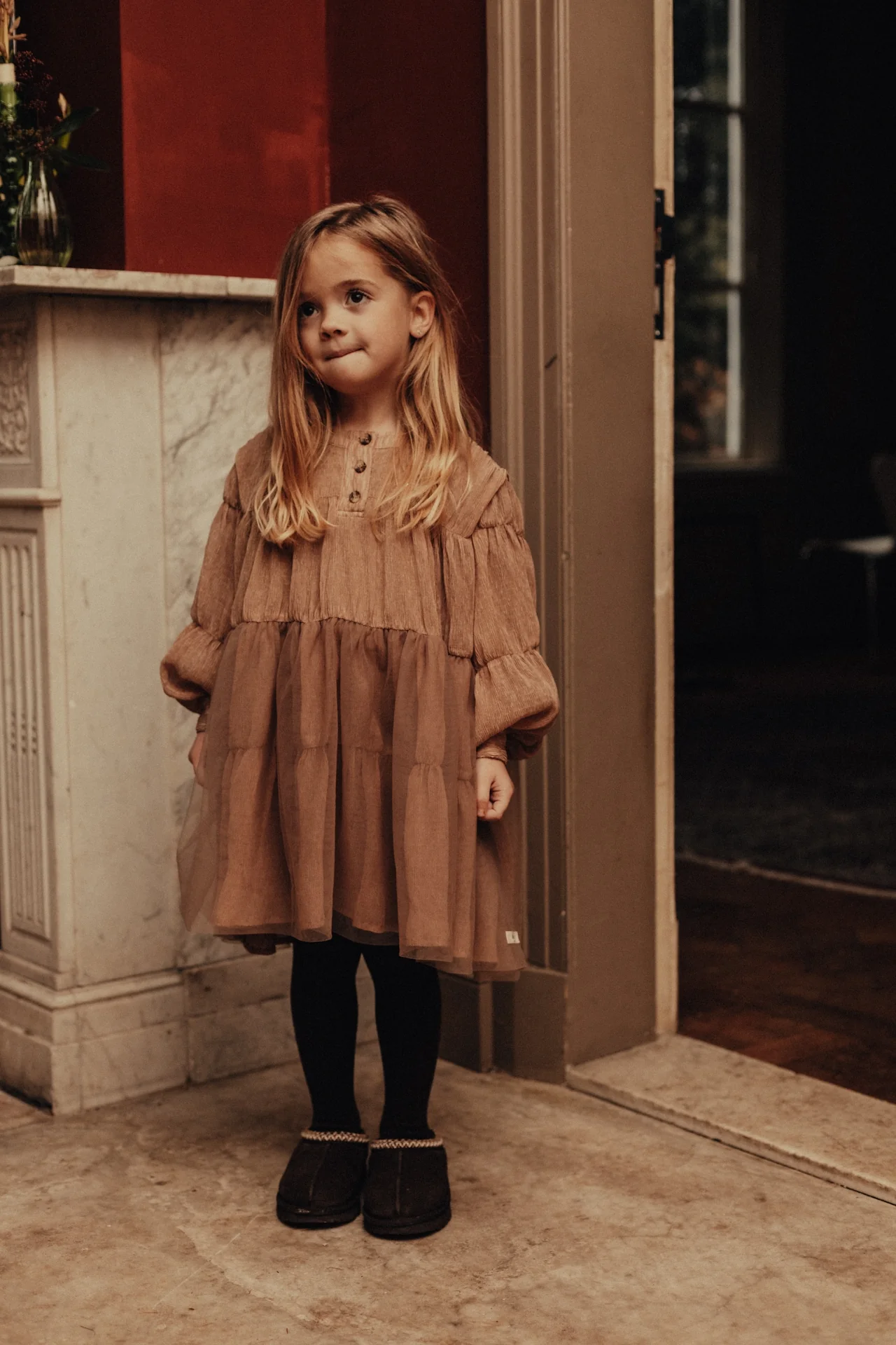 Feestelijke jurk met lange mouwen van Baje Studio in een warme bruine kleur. Het uitlopende model heeft een wijde pasvorm, een ronde hals met knoopjes en is uitgevoerd in verschillende laagjes. Lees meer
