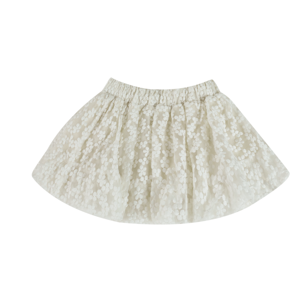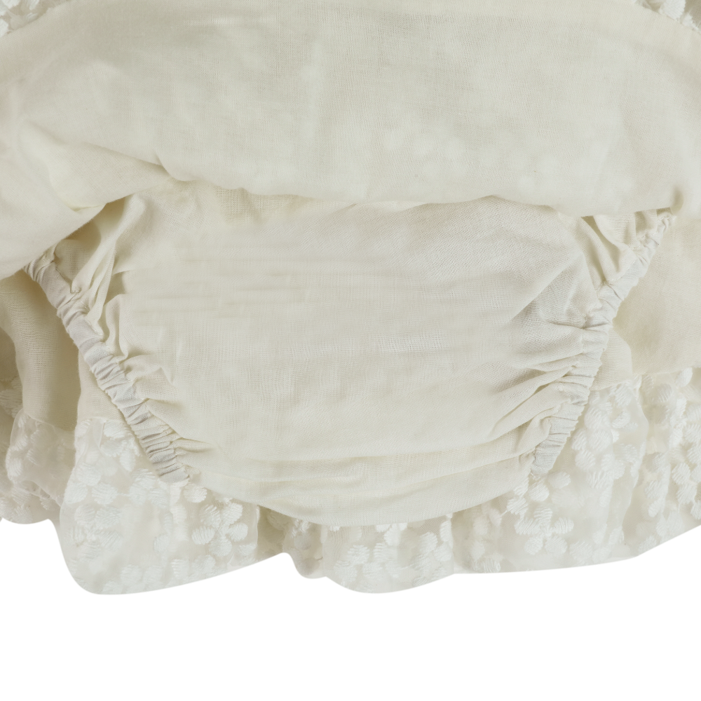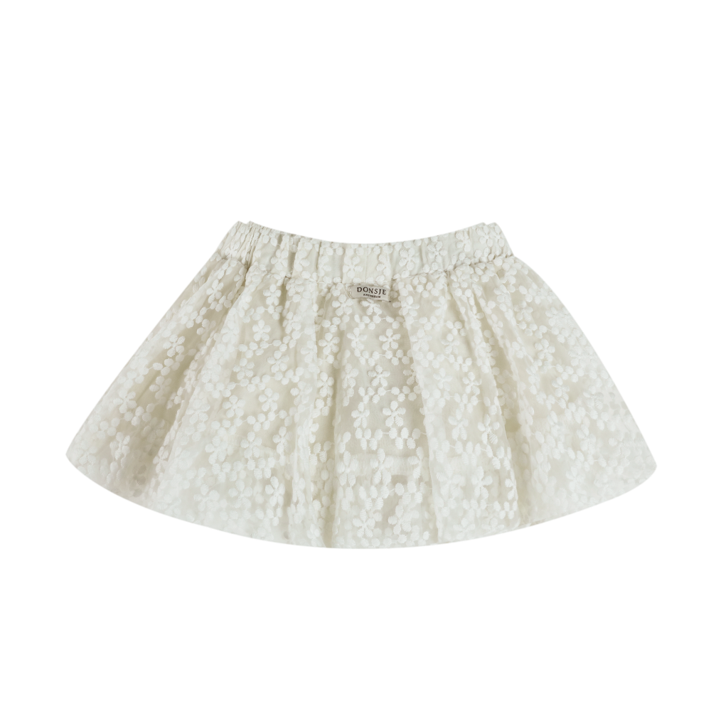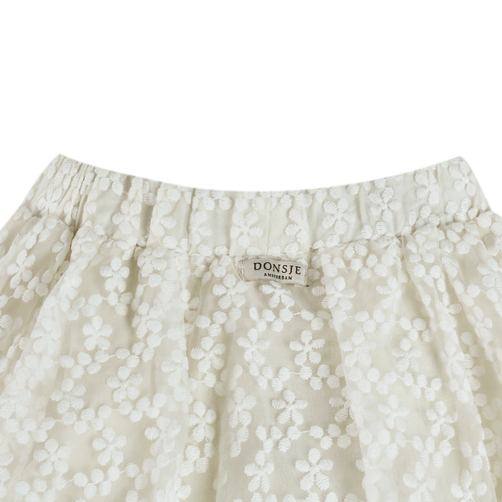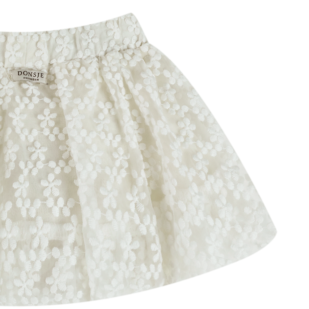 Prachtig baby rokje van Donsje met luxe borduurwerk in een warme witte kleur met broekje. Leuk in combinatie met een mooie romper of een blouse. Donsje valt normaal op maat tot iets groter, zie onderaan de pagina een overzicht van de maten.