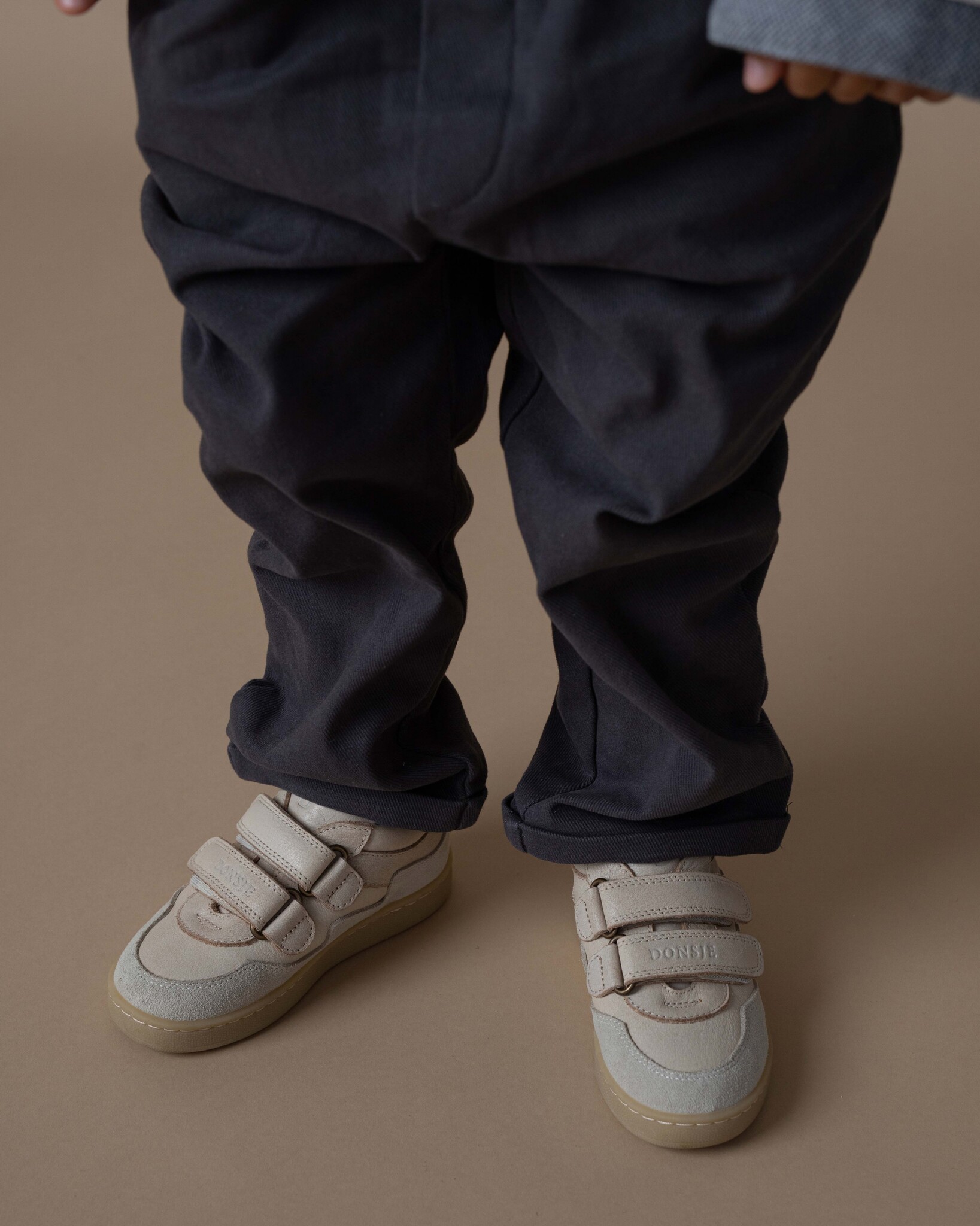 Tijdloze leren sneaker van Donsje in crème suède. De musthave schoenen hebben een handige klittenband sluiting en zijn te combineren met elke outfit.