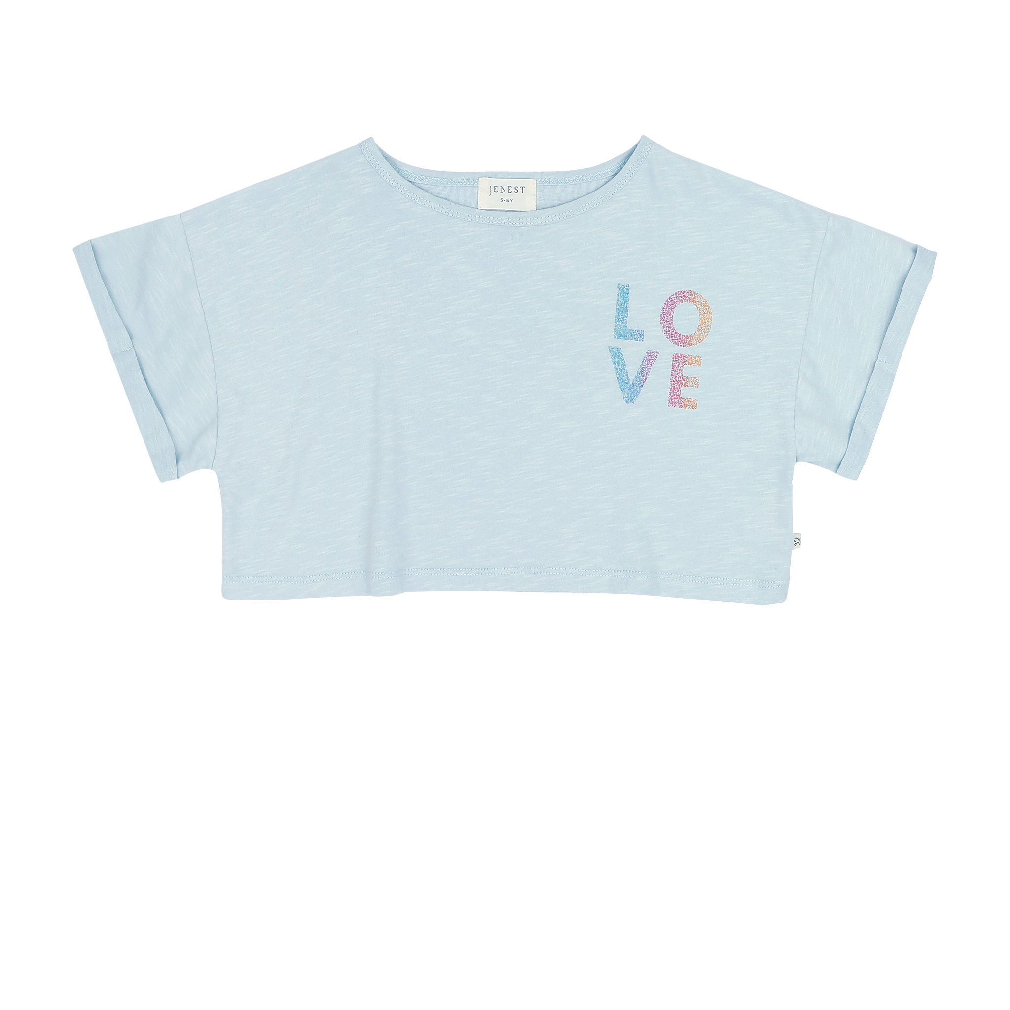 Cropped t-shirt van Jenest in een licht blauwe kleur. Het korte model heeft een 'LOVE' print in een rainbow metallic aan de voorkant en een hartje aan de achterkant. Hij is gemaakt van organic cotton. Lees meer