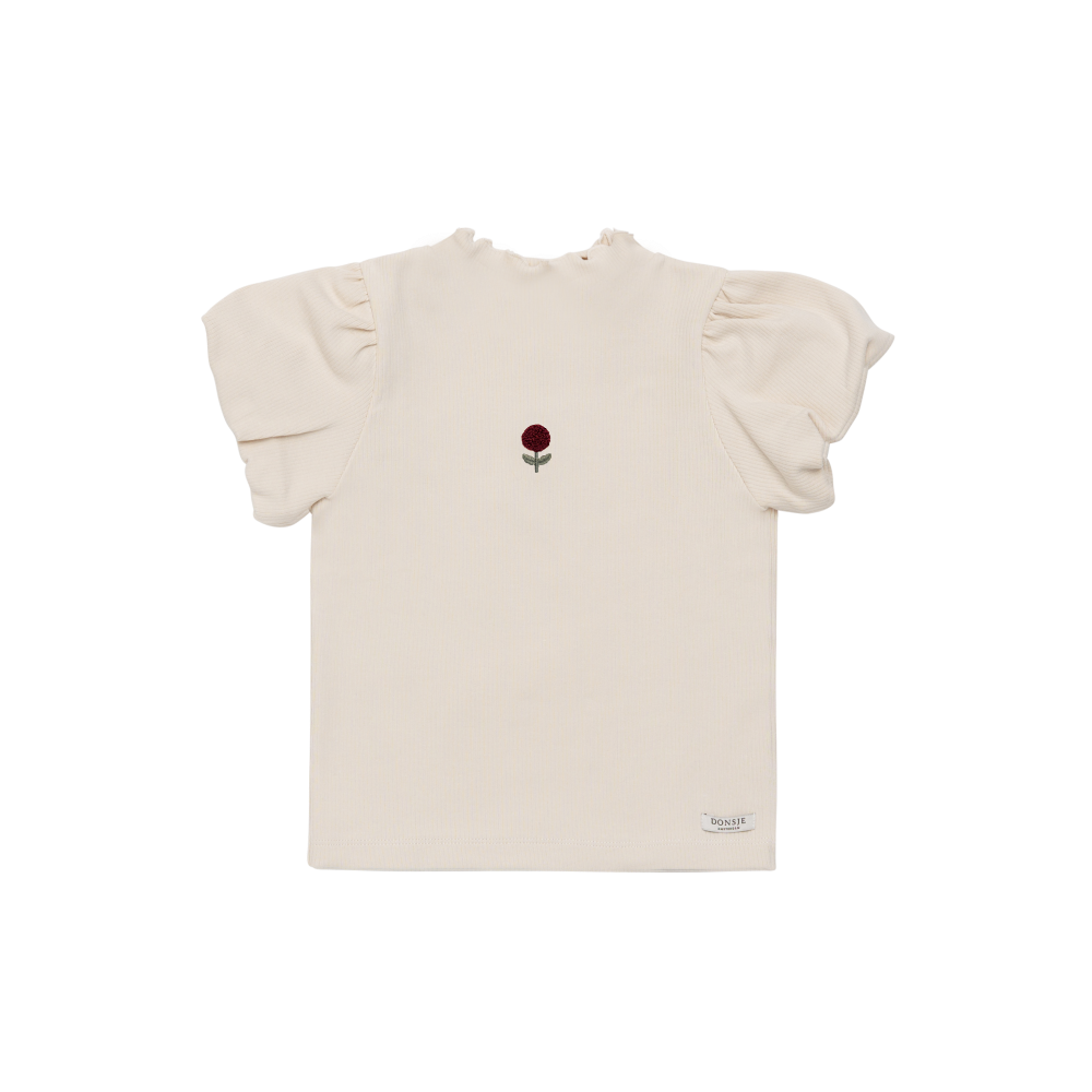 Zachte top met korte pofmouwtjes van Donsje in een lichte kleur. Het aangesloten model heeft een geboorduurde bloem en een subtiel ruffle kraagje. Hij is gemaakt van organic cotton en een klein beetje elastaan. Lees meer