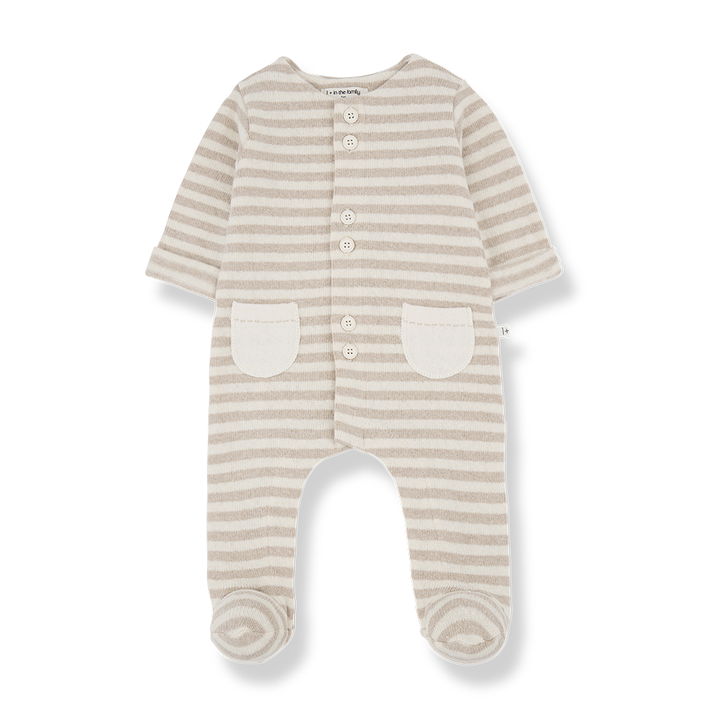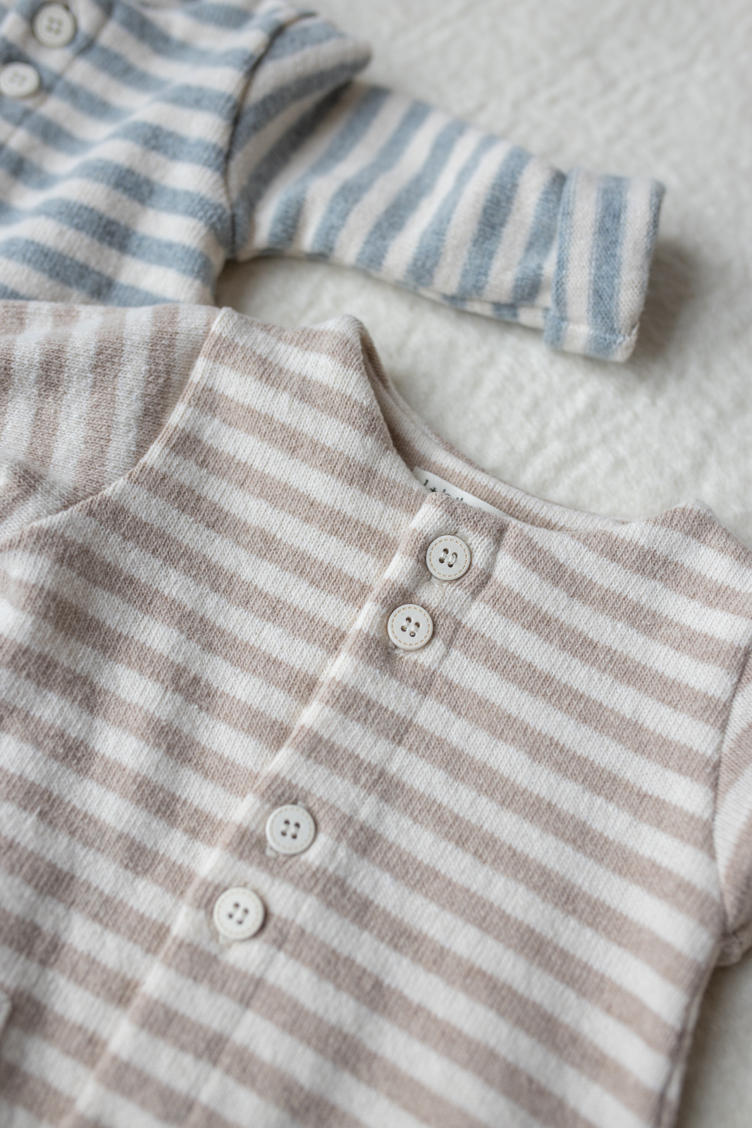 Prachtig gestreept newborn pakje van 1+ in the family met voetjes van organic cotton fleece in een neutrale beige kleur. Hij heeft 2 schattige zakjes en houten knoopjes aan de voorkant. One more in the family valt iets kleiner dan normaal. Zie onderaan de pagina een overzicht van de maten.
