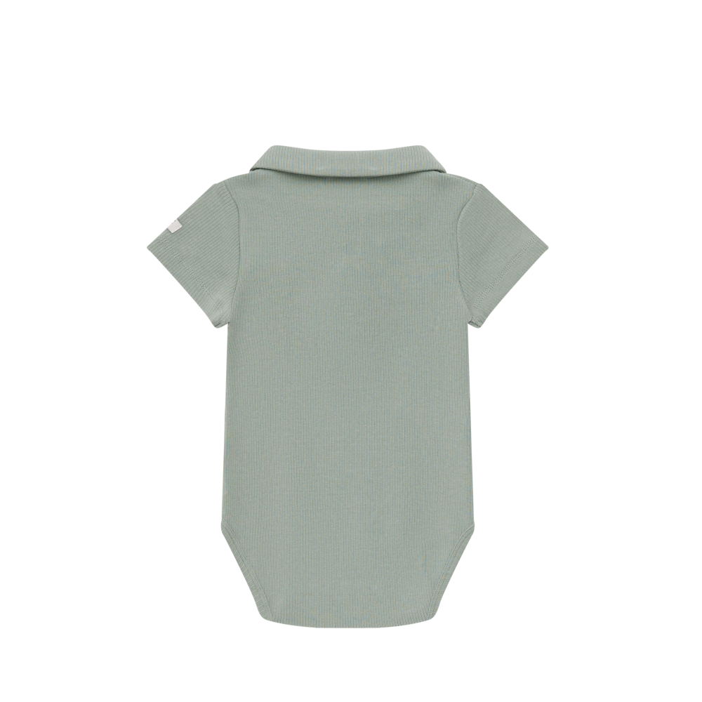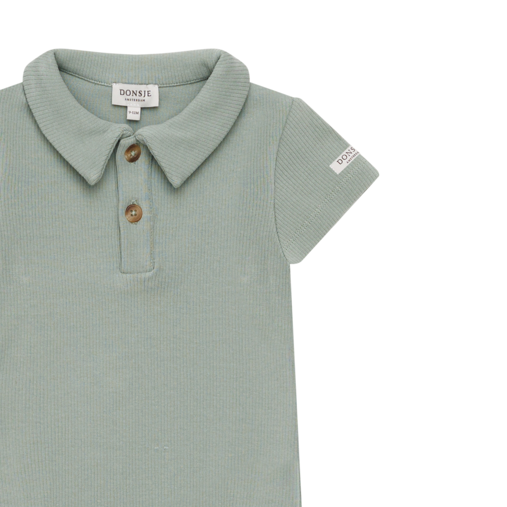 Zachte baby romper van Donsje in een prachtige groene kleur met kraagje en korte mouw. Hij is gemaakt van een stevige organic cotton. Lees meer