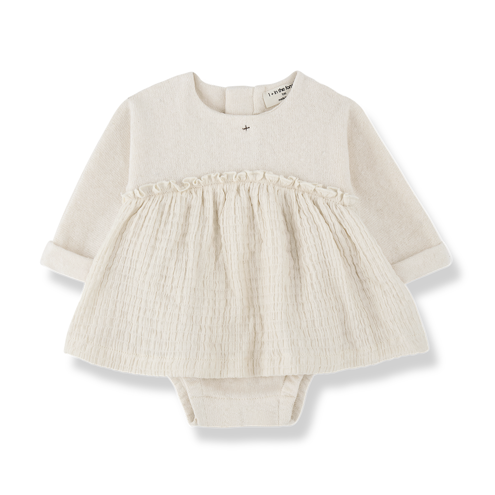 Elegant ecru baby jurkje van 1+ in the family van organic cotton fleece. Het uitlopende model heeft een handige warme body. Ideaal voor bij een feestelijke gelegenheid. Lees meer