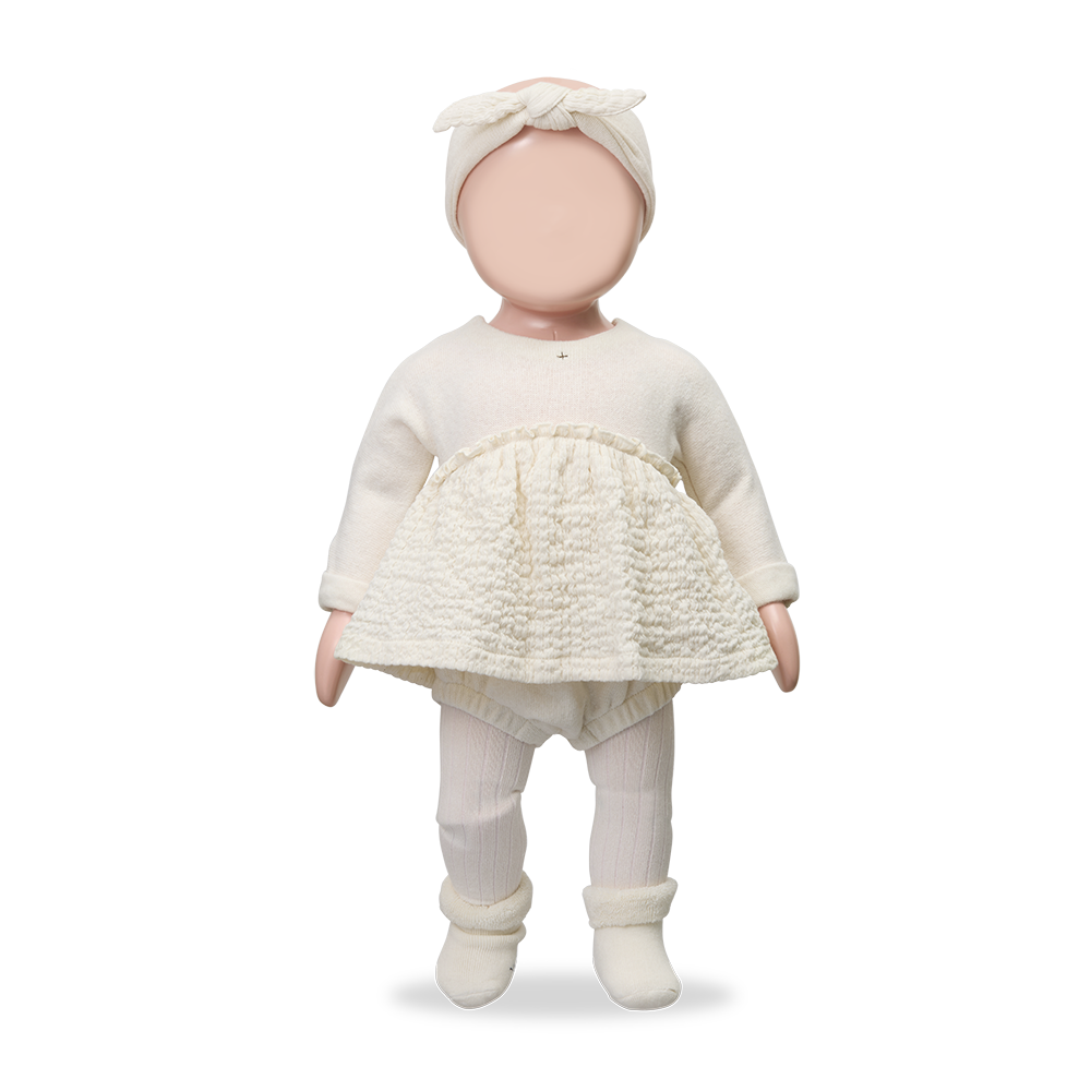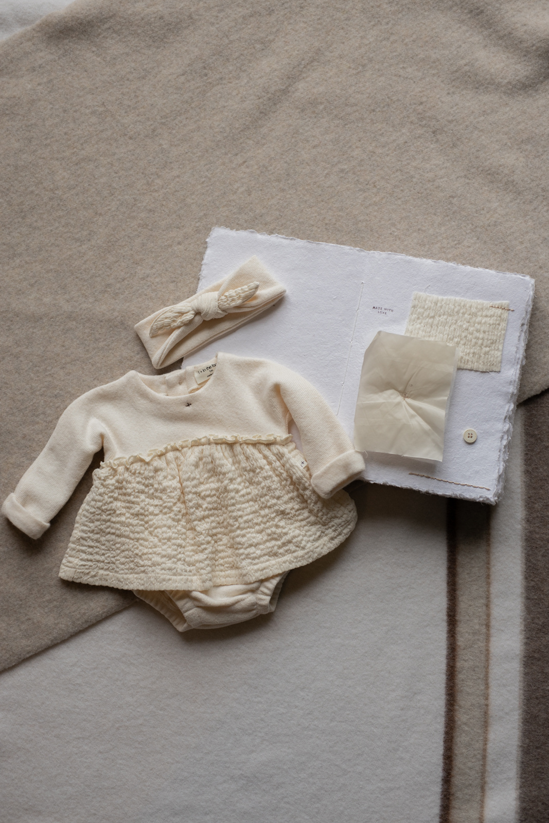 Elegant ecru baby jurkje van 1+ in the family van organic cotton fleece. Het uitlopende model heeft een handige warme body. Ideaal voor bij een feestelijke gelegenheid. One more in the family valt iets kleiner dan normaal. Zie onderaan de pagina een overzicht van de maten.