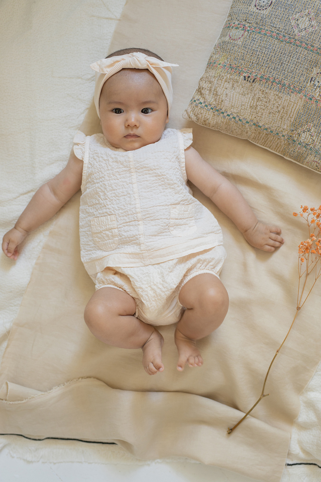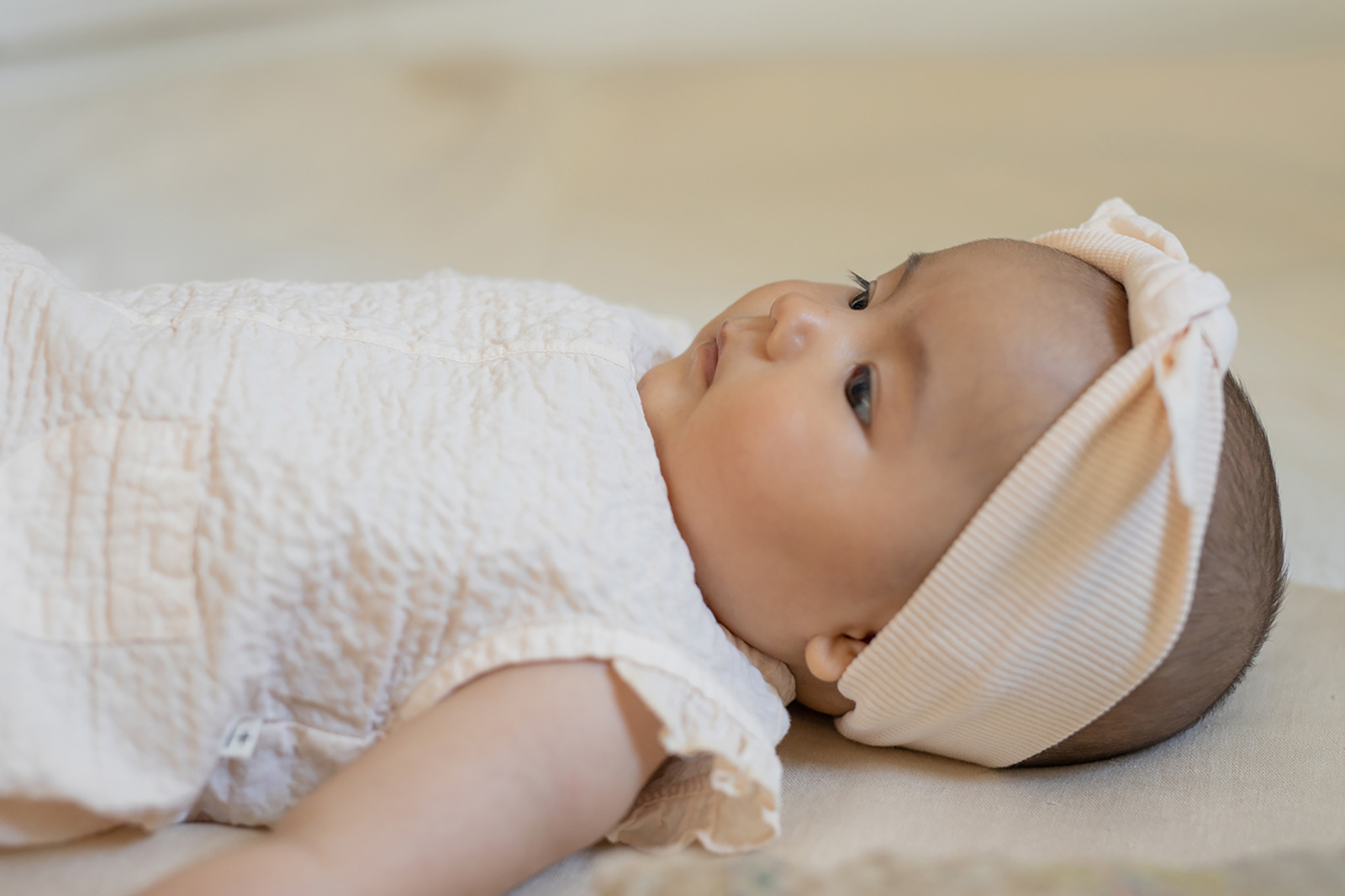 Zachte baby haarband in een prachtige ecru kleur met een knoop detail van 1 + in the family. Lees meer