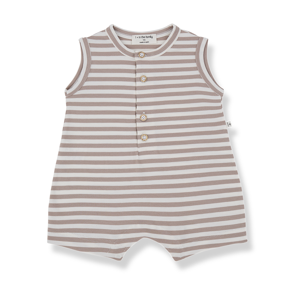 Prachtig zacht baby pakje van 1+ in the family in een licht bruine streep. Het korte mouwloze model heeft houten knoopjes aan de voorkant en een handige drukknoop sluiting aan de onderkant. Hij is gemaakt van duurzaam materiaal. Lees meer