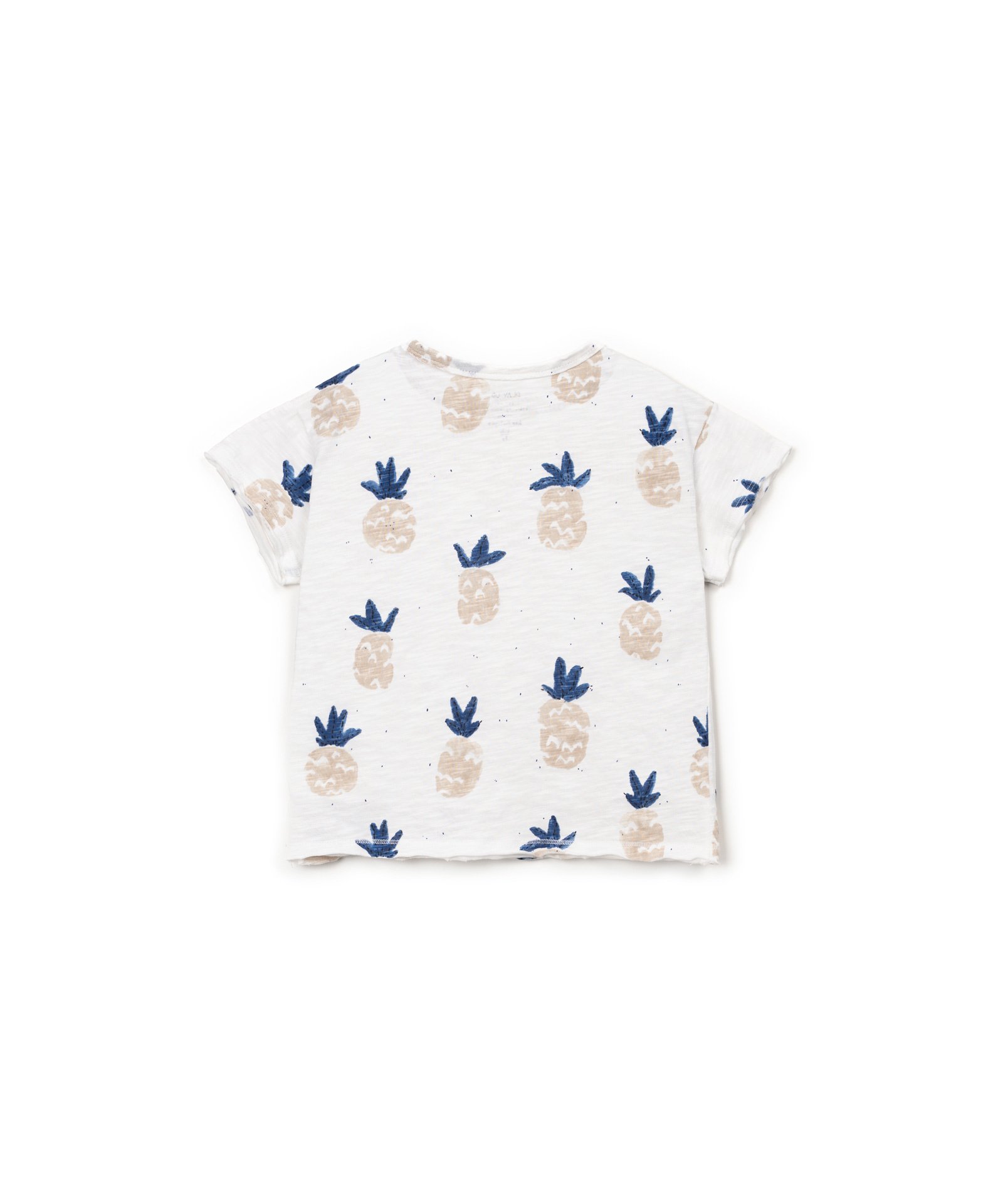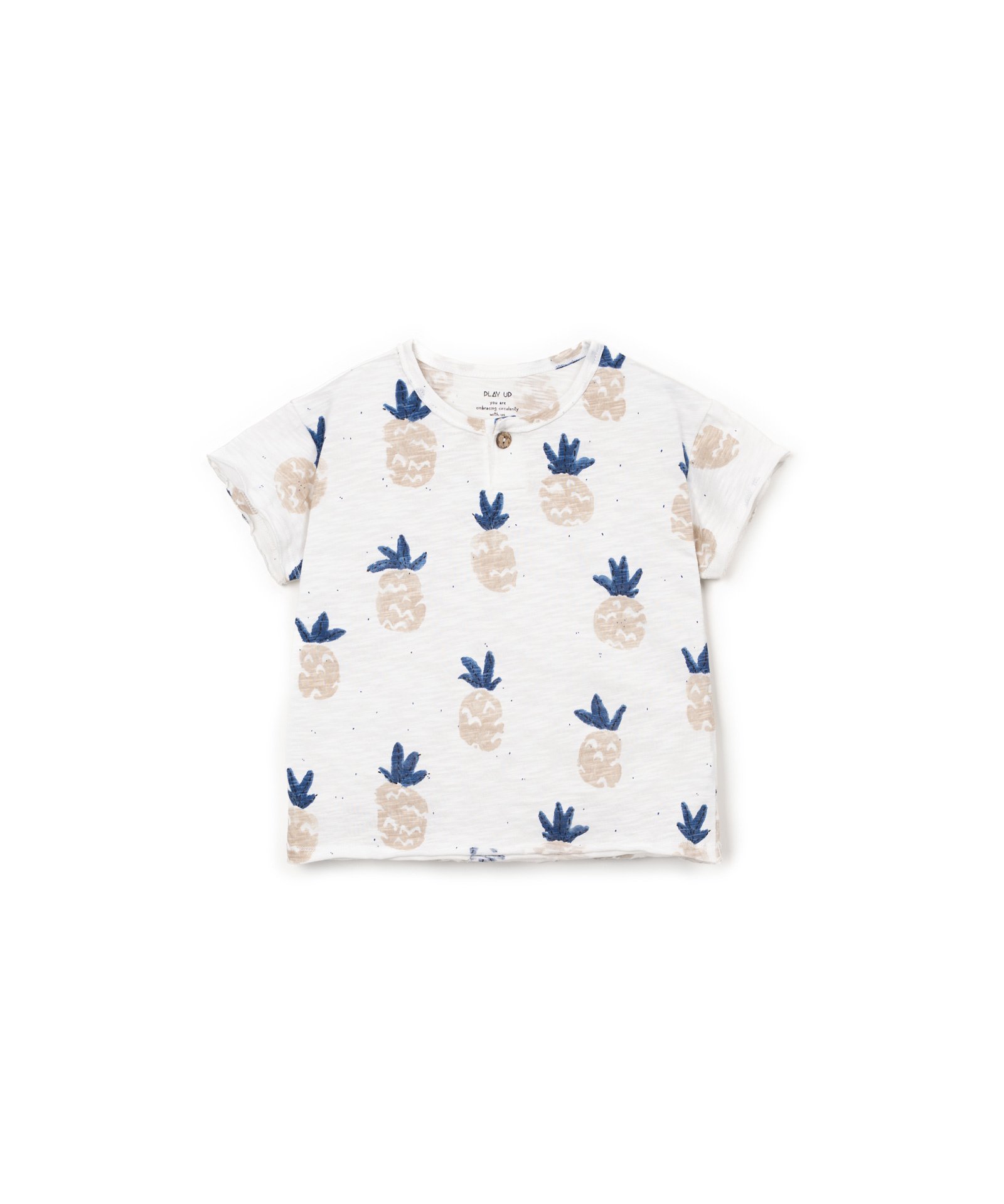 Katoenen t-shirt met blauwe ananas print van Play Up. Het shirt heeft een ronde hals met een decoratief knoopje en een rechte pasvorm. Hij is gemaakt van orgranic cotton. Zie onderaan de pagina voor een overzicht van de maten.
