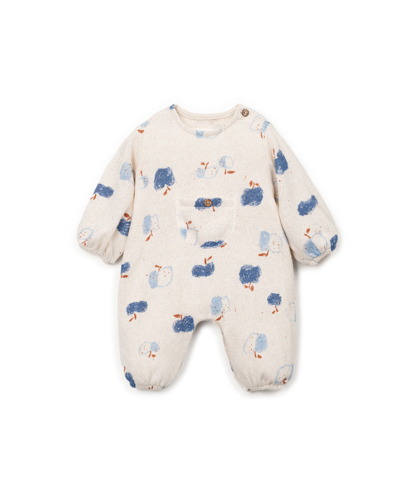 Lief baby pakje van Play Up in een blauwe appeltjes print met een decoratief zakje aan de voorkant. Het relaxte model heeft een ronde hals, elastische boorden, een knoopje bij de schouder en handige drukknoopjes aan de onderkanten. Hij is gemaakt van een zacht duurzaam materiaal. Zie onderaan de pagina voor een overzicht van de maten.