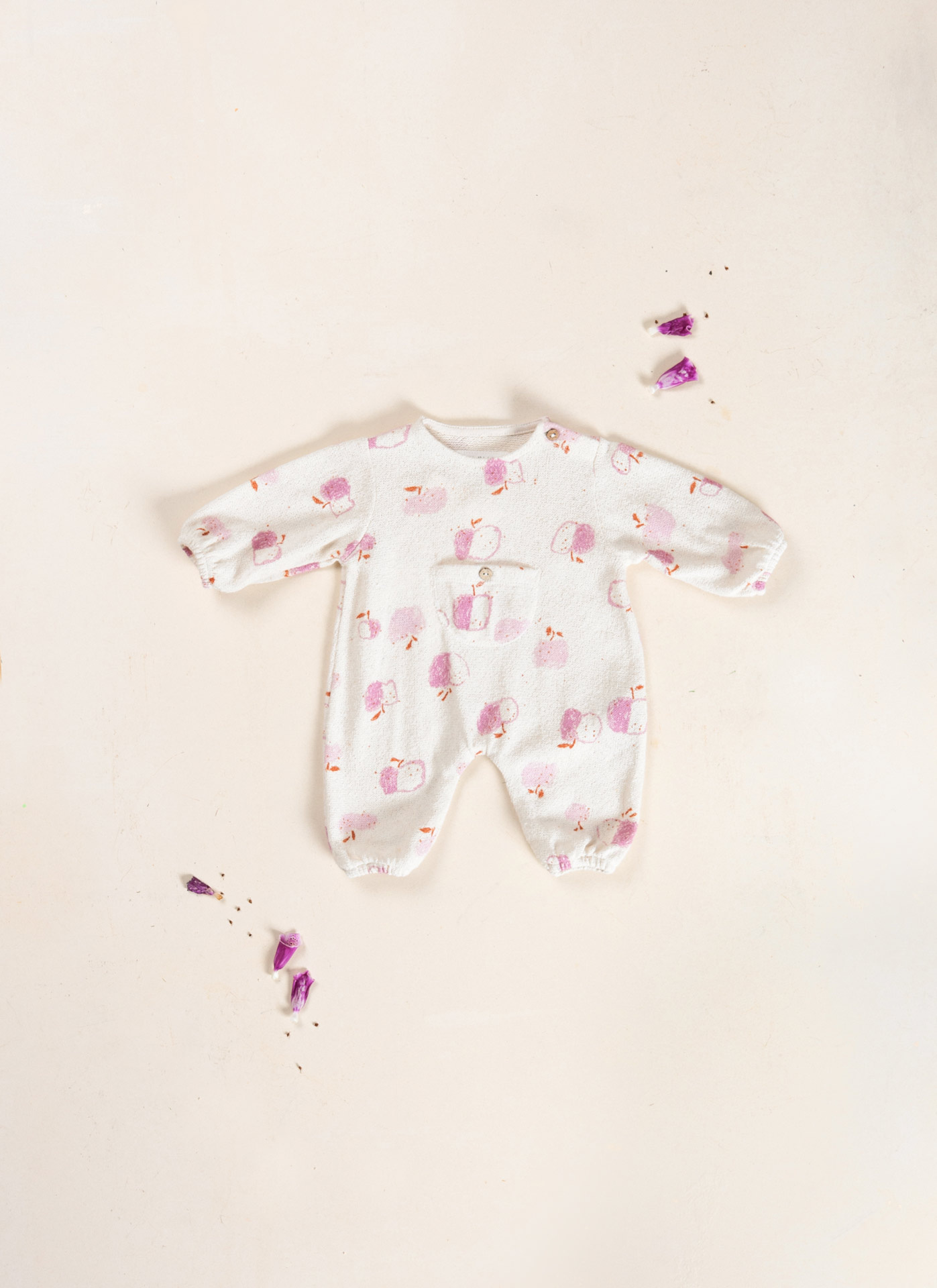 Lief baby pakje van Play Up in een roze appeltjes print met een decoratief zakje aan de voorkant. Het relaxte model heeft een ronde hals, elastische boorden, een knoopje bij de schouder en handige drukknoopjes aan de onderkanten. Hij is gemaakt van een zacht duurzaam materiaal. Zie onderaan de pagina voor een overzicht van de maten.