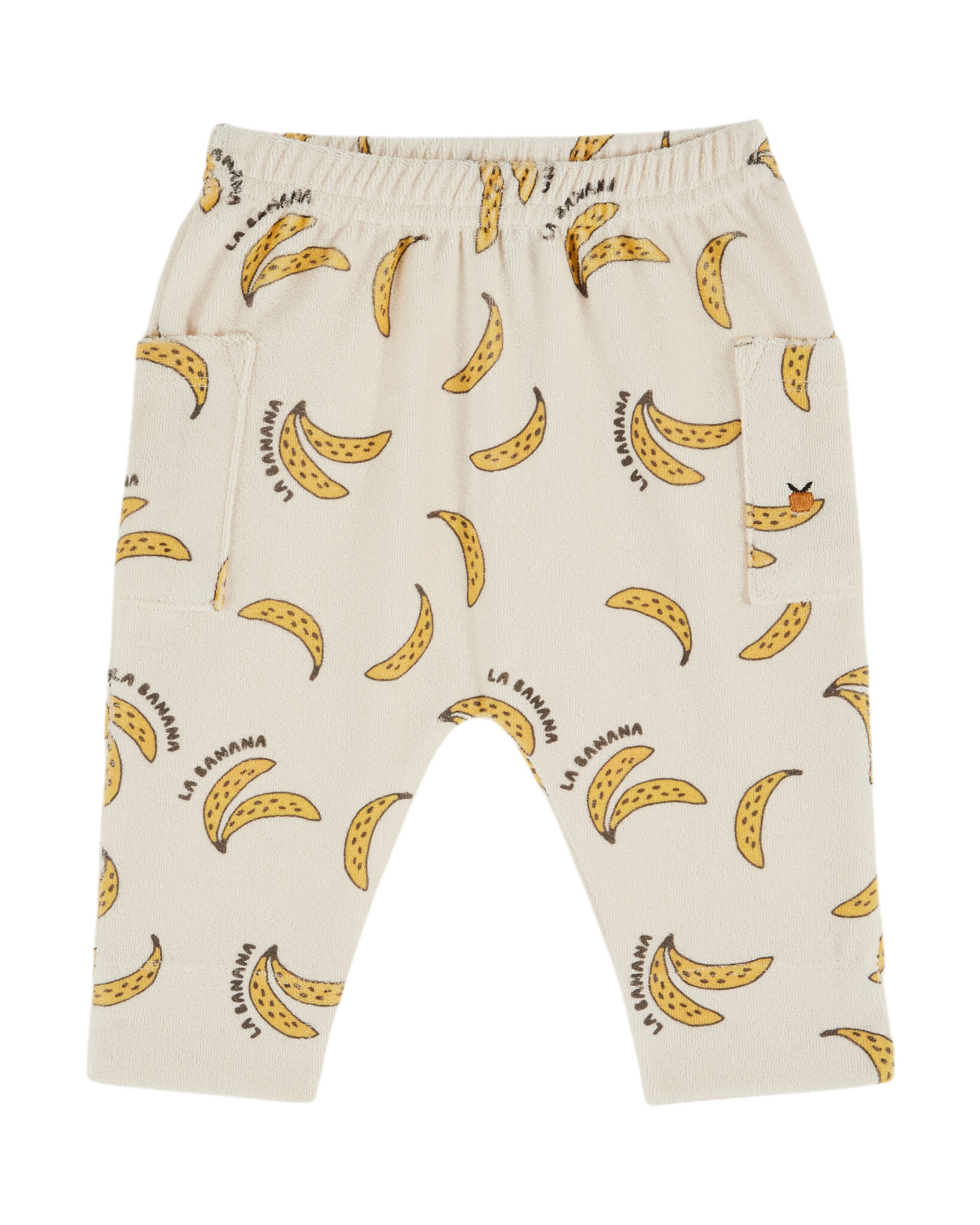 Zacht badstof baby broekje van Emile et ida met een vrolijke bananen print. Het lichte broekje heeft een elastische taille en zakjes aan de zijkant. Hij is gemaakt van een organic cotton blend. Het merk Emile valt iets kleiner dan normaal, zie onderaan de pagina voor een overzicht van de maten.