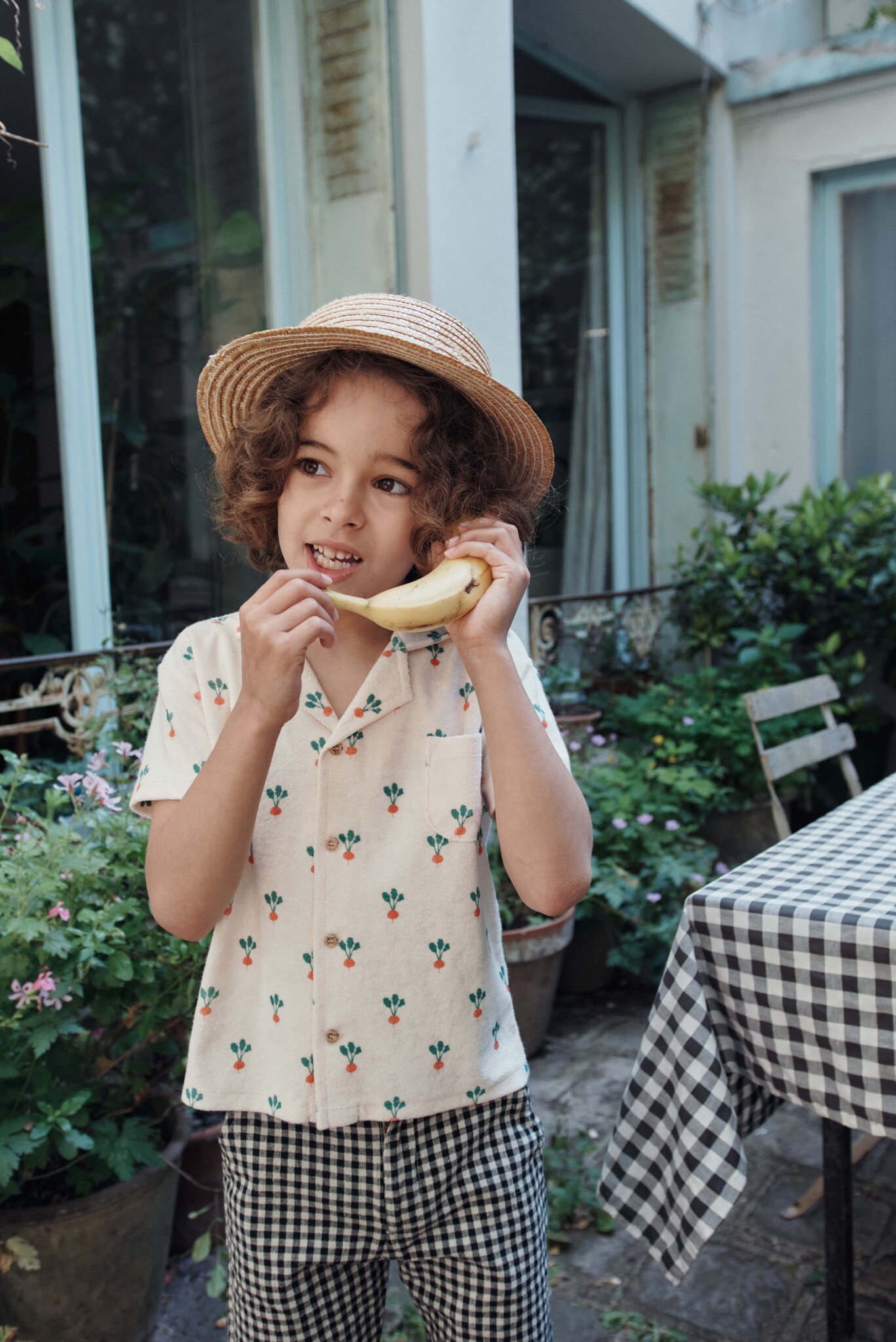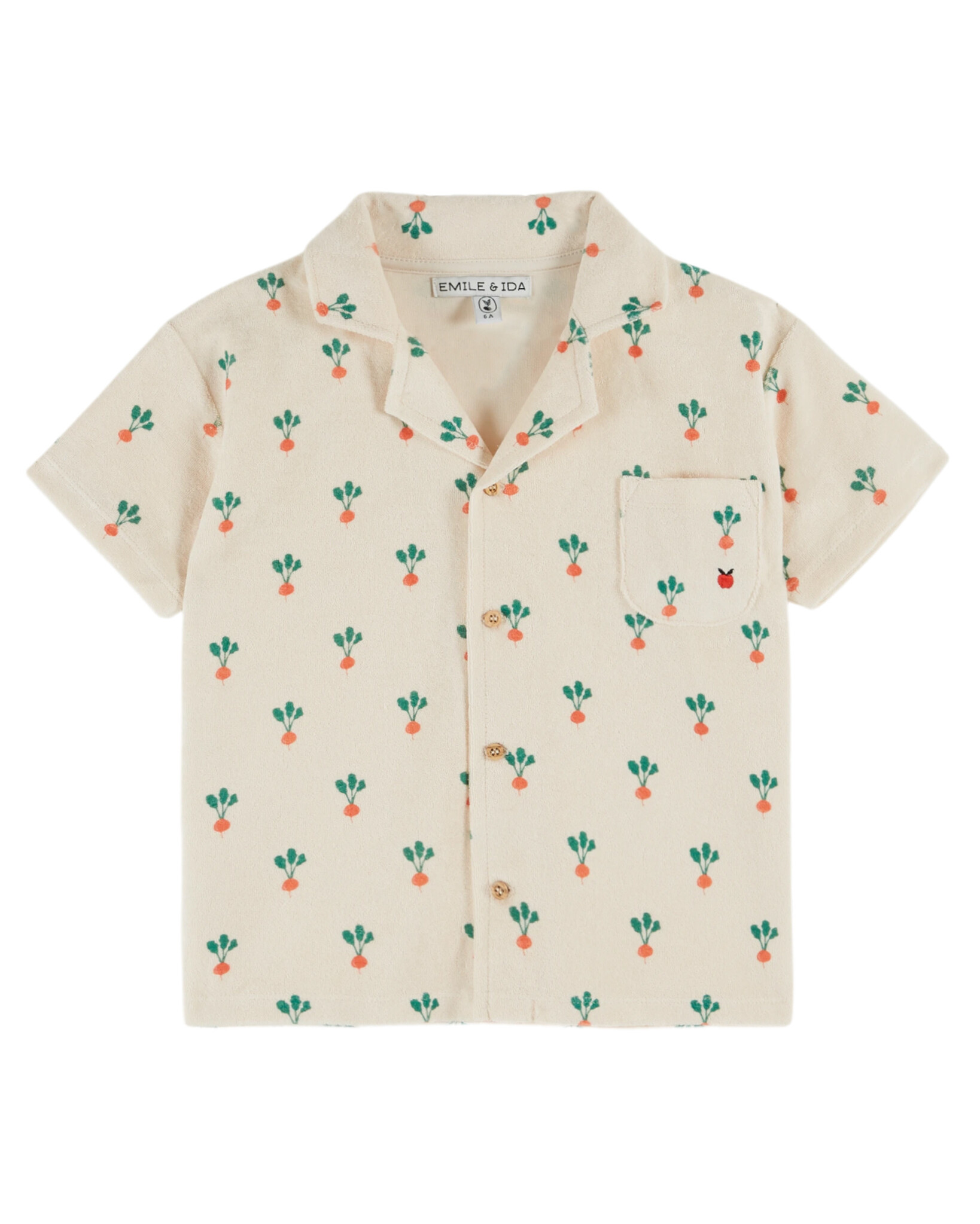 Zachte badstof polo van Emile et ida met een all-over radijsjes print. De rechte top heeft een kraagje, een schattig zakje op de borst en knoopjes van boven tot onder. Lees meer
