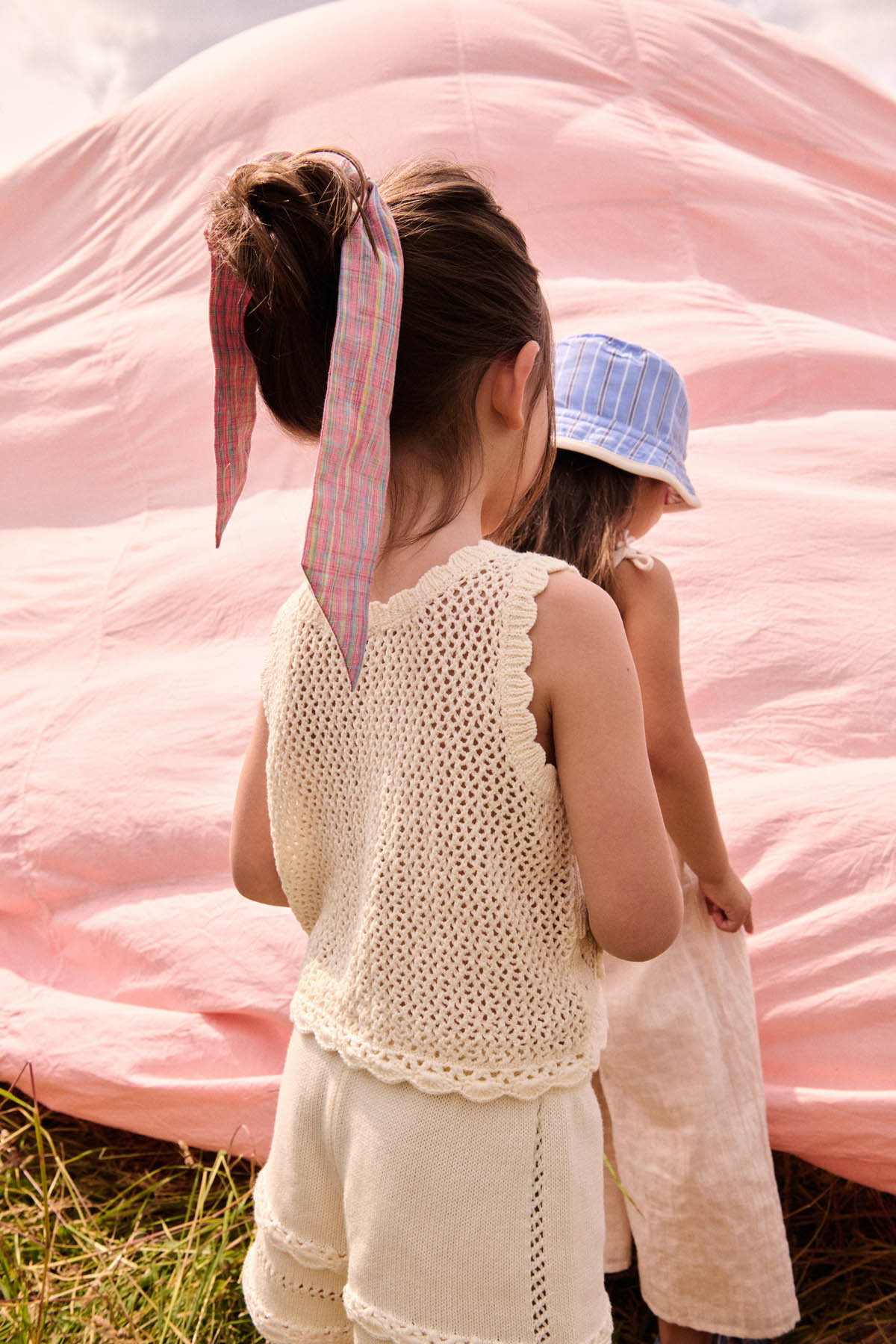 Versier je kapsel (of pols) met deze scrunchie in prachtige roze ruit van Louise Misha. Hij heeft twee linten om naar wens te strikken. Louise Misha valt klein tot normaal zie onderaan de pagina voor een overzicht van de maten.