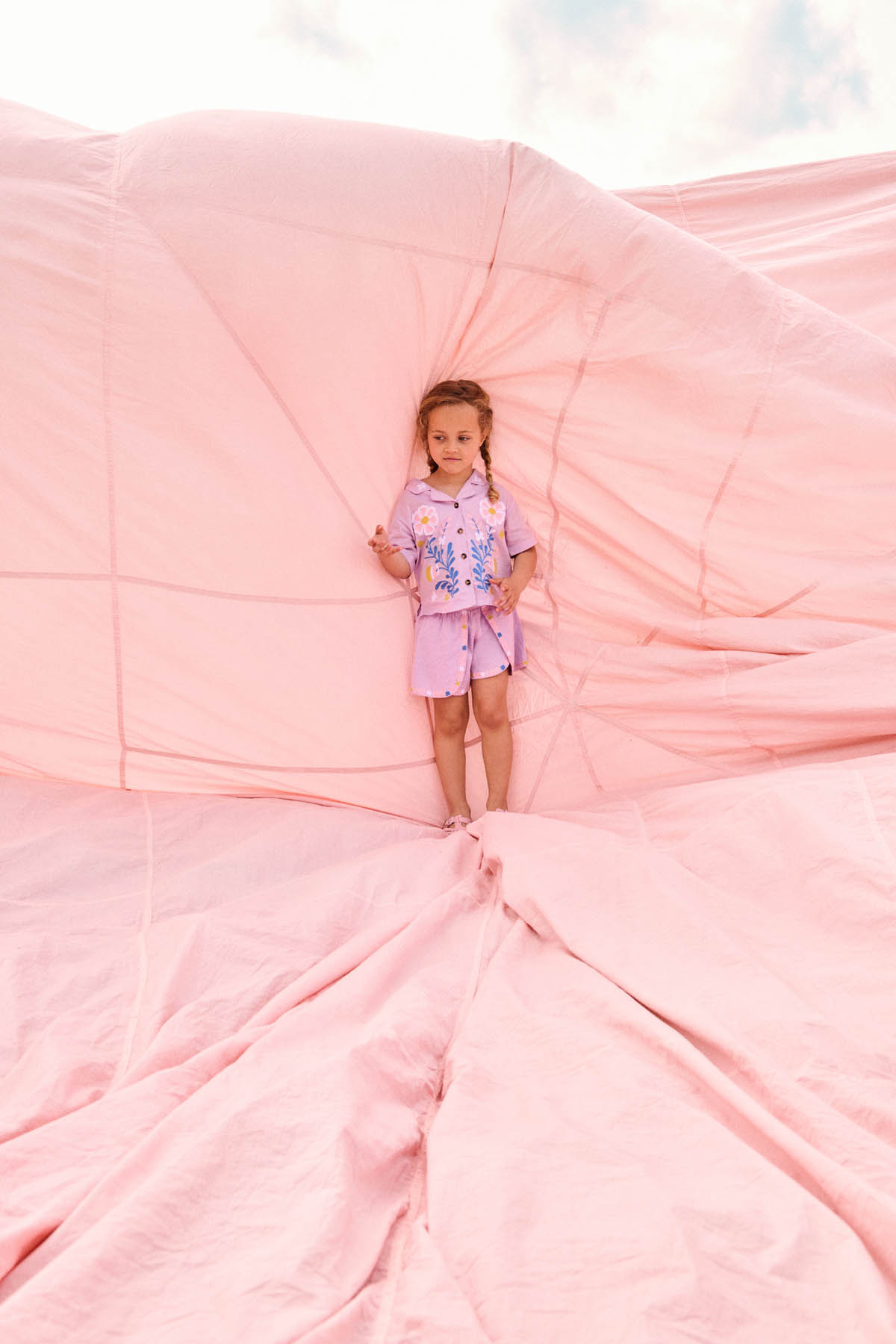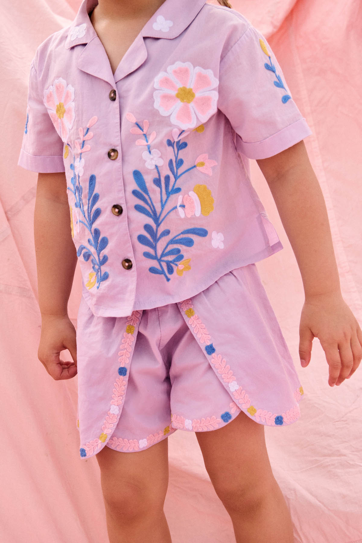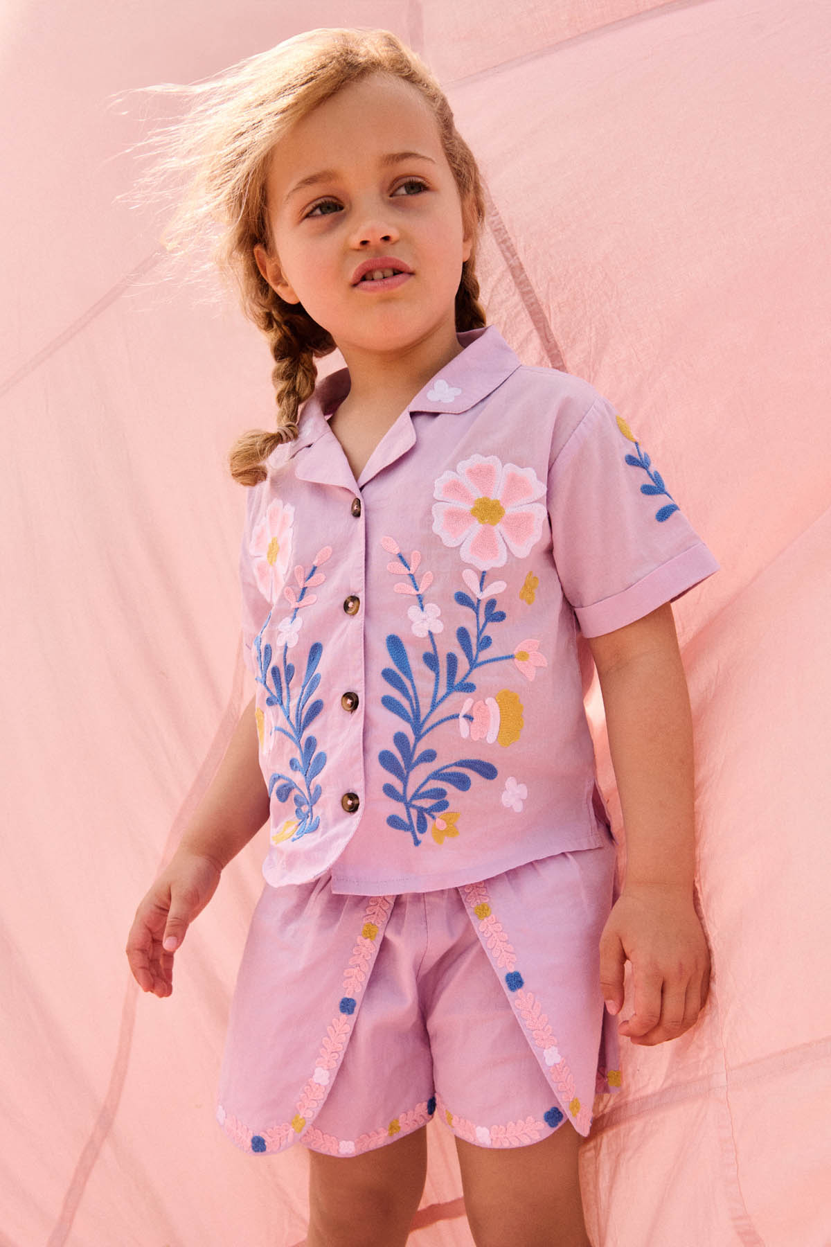 Te gekke short van Louise Misha in een licht paarse kleur met geborduurde details. Het korte model met elastische taille heeft een overslag effect en kleurrijke bloemdetails langs de randen. Er is ook een bijpassende top en hij is gemaakt van organic cotton. Louise Misha valt klein tot normaal zie onderaan de pagina voor een overzicht van de maten.