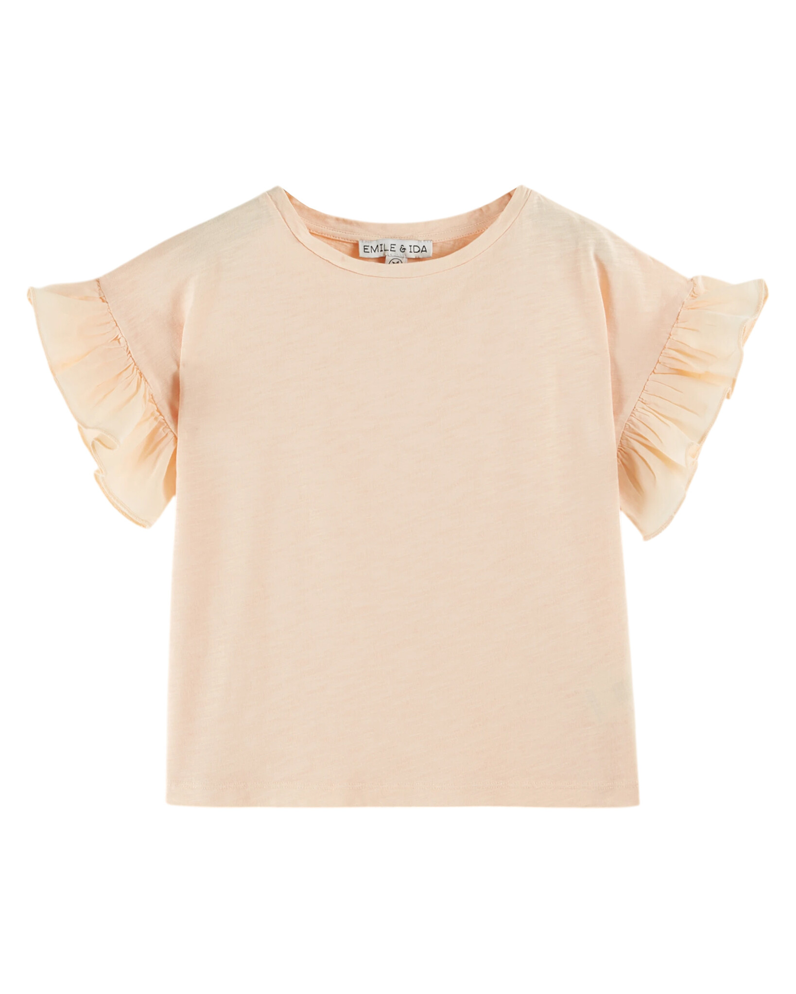 Lief t-shirt van Emile et ida in een licht oranje kleur met ruffle mouwtje. Het rechte model heeft een ronde halslijn en is gemaakt van een fijne organic cotton. Lees meer
