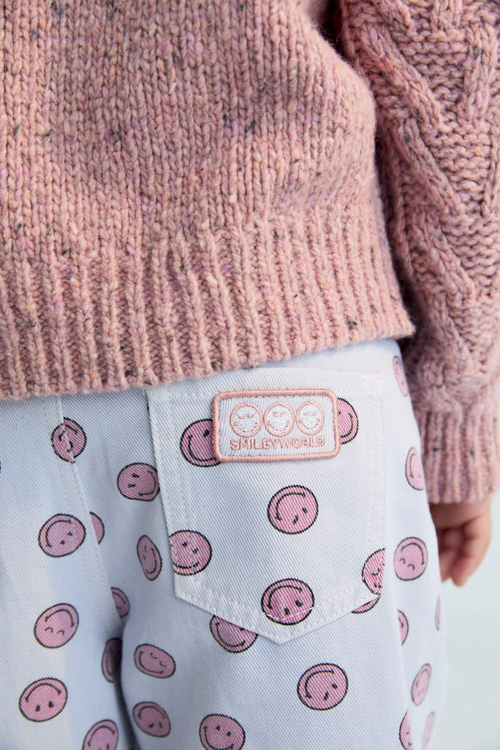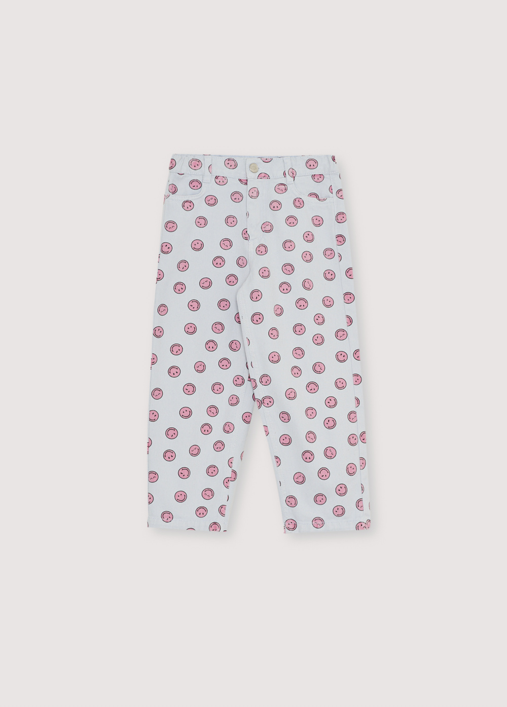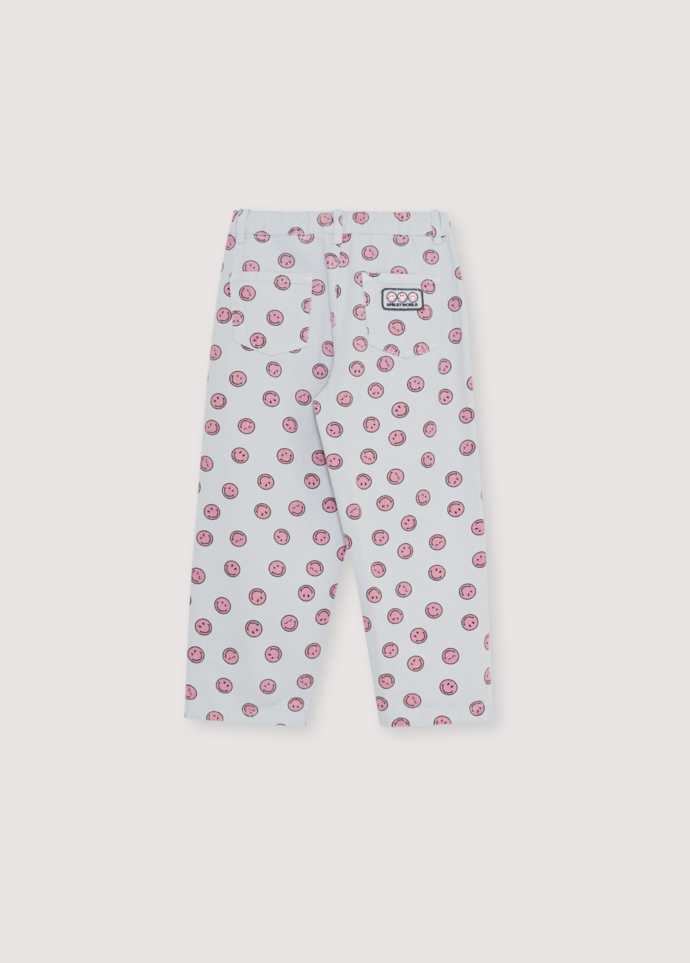 Te gekke licht blauwe denim broek met zakken van The New Society met vrolijke all-over roze smiley print. Hij is gemaakt van een stevige organic cotton en heeft een handige elastisch verstelbare tailleband.The New Society valt aan de kleine kant, zie onderaan de pagina een overzicht van de maten.
