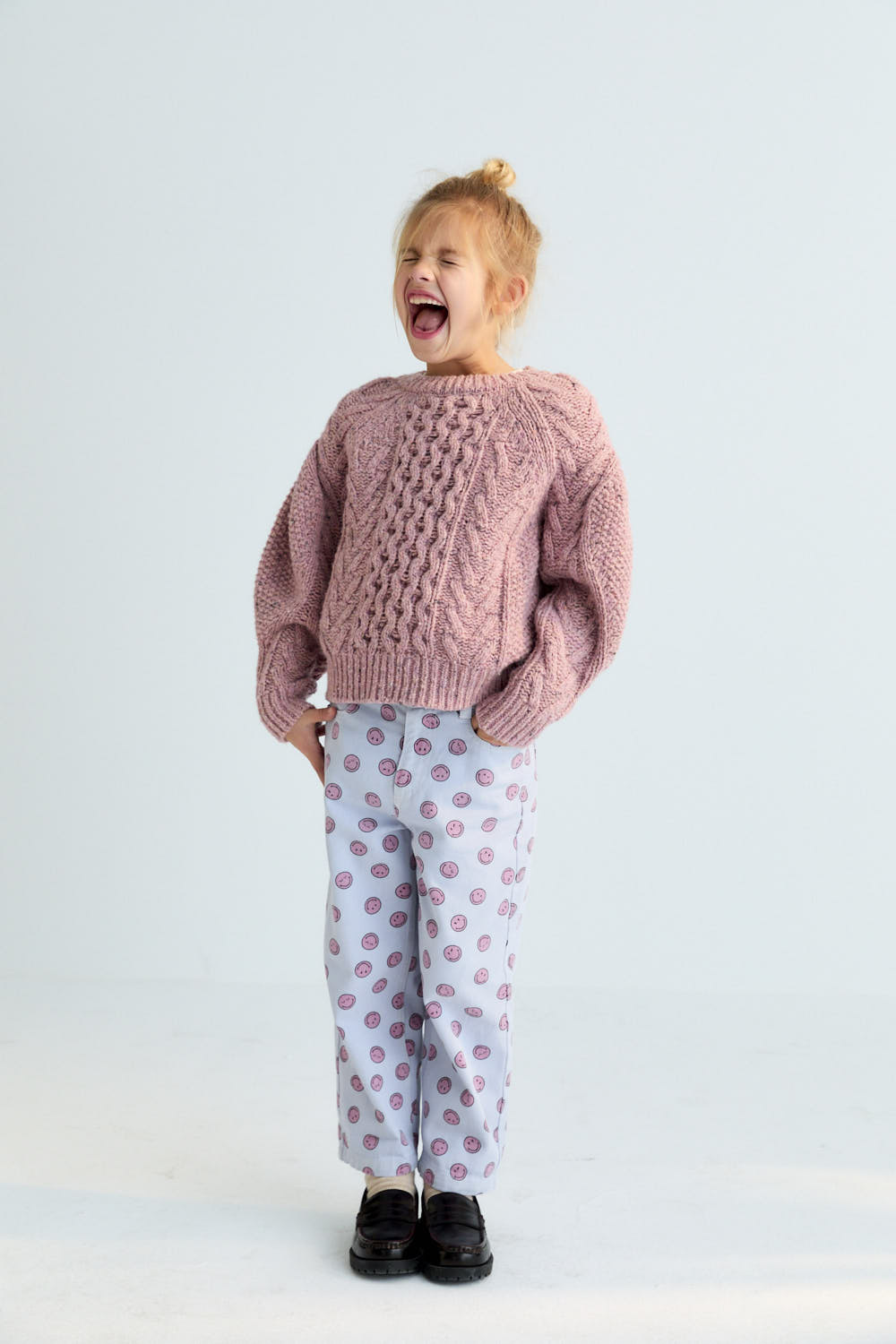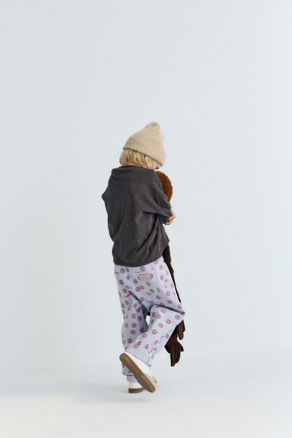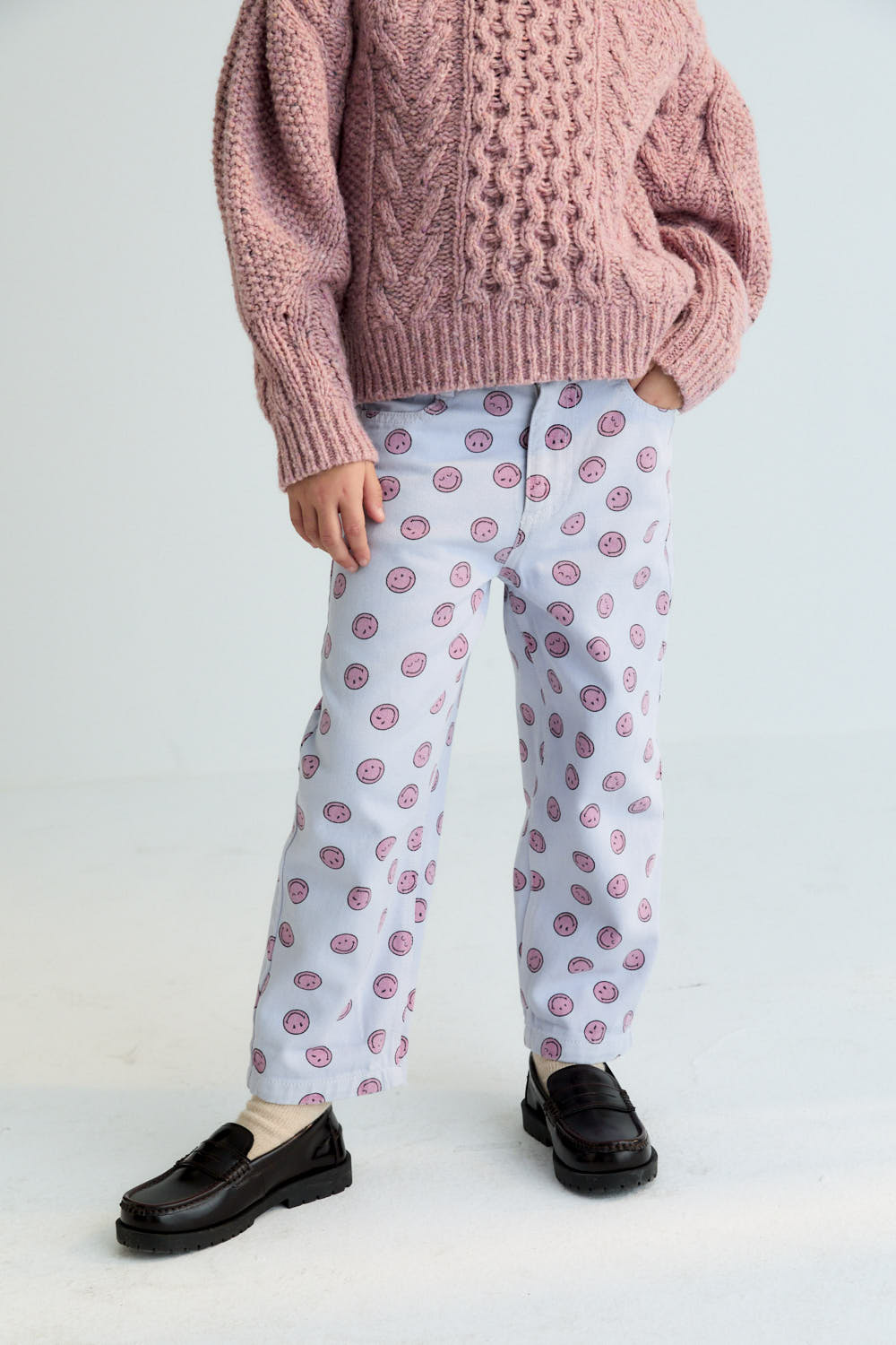 Te gekke licht blauwe denim broek met zakken van The New Society met vrolijke all-over roze smiley print. Hij is gemaakt van een stevige organic cotton en heeft een handige elastisch verstelbare tailleband.The New Society valt aan de kleine kant, zie onderaan de pagina een overzicht van de maten.