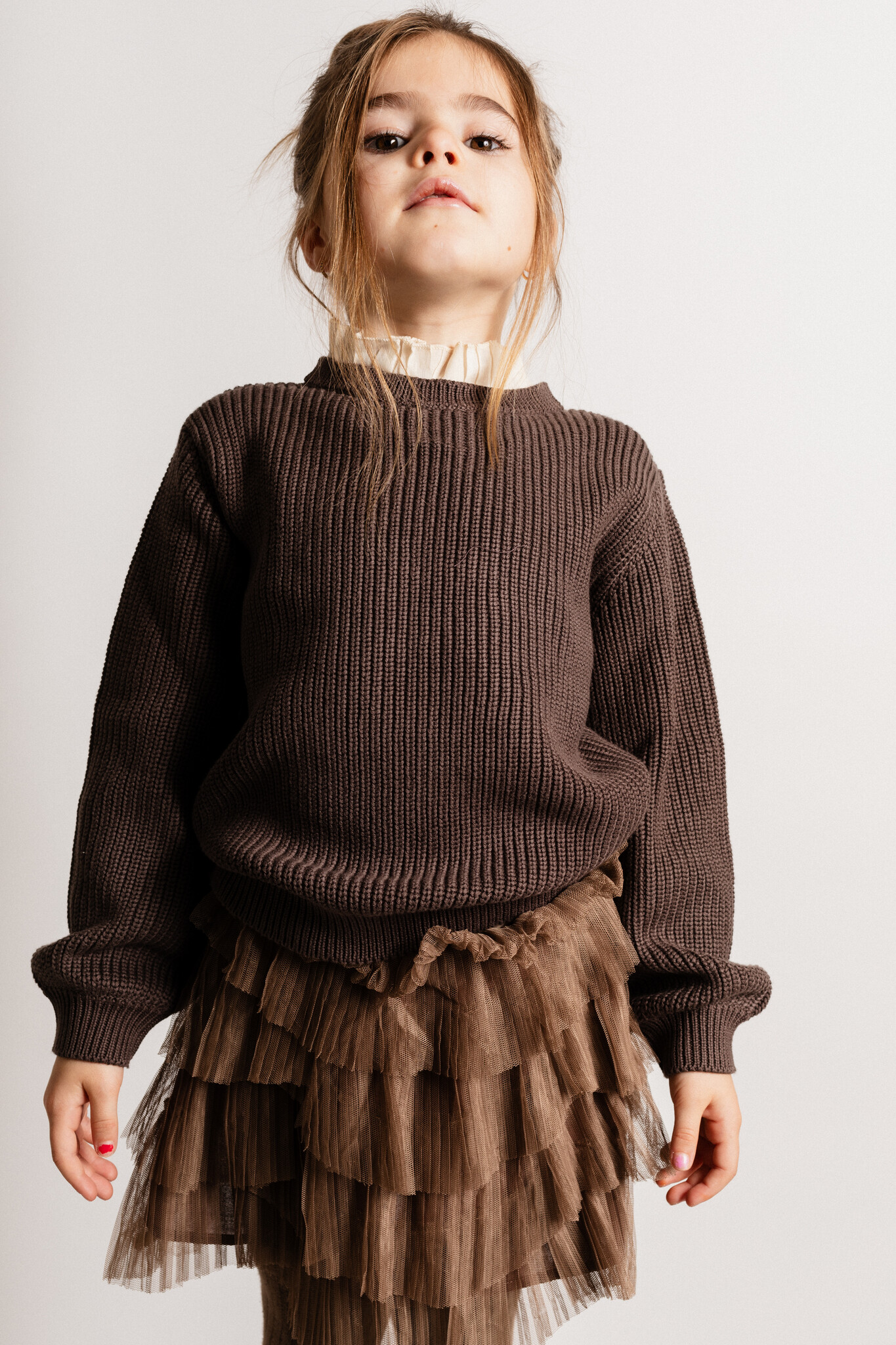 Deze bestseller trui van Baje Studio is terug van weggeweest. De grof gebreide sweater heeft relaxte schouders, een contrasterend ruffle kraagje en geribbelde boorden. Hij is uitgevoerd in een prachtige donker bruine kleur. Lees meer