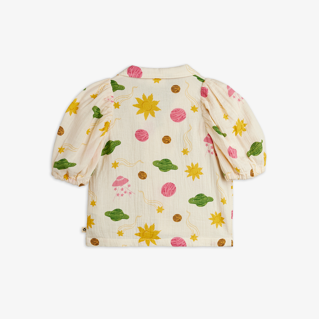 Zomerse blouse van Mini Rodini in een luchtige muslin stof. De top is uitgevoerd met korte pofmouwen en een all-over space print. Hij heeft een kraagje, knoopjes van boven tot onder en is gemaakt van organic cototn. Lees meer