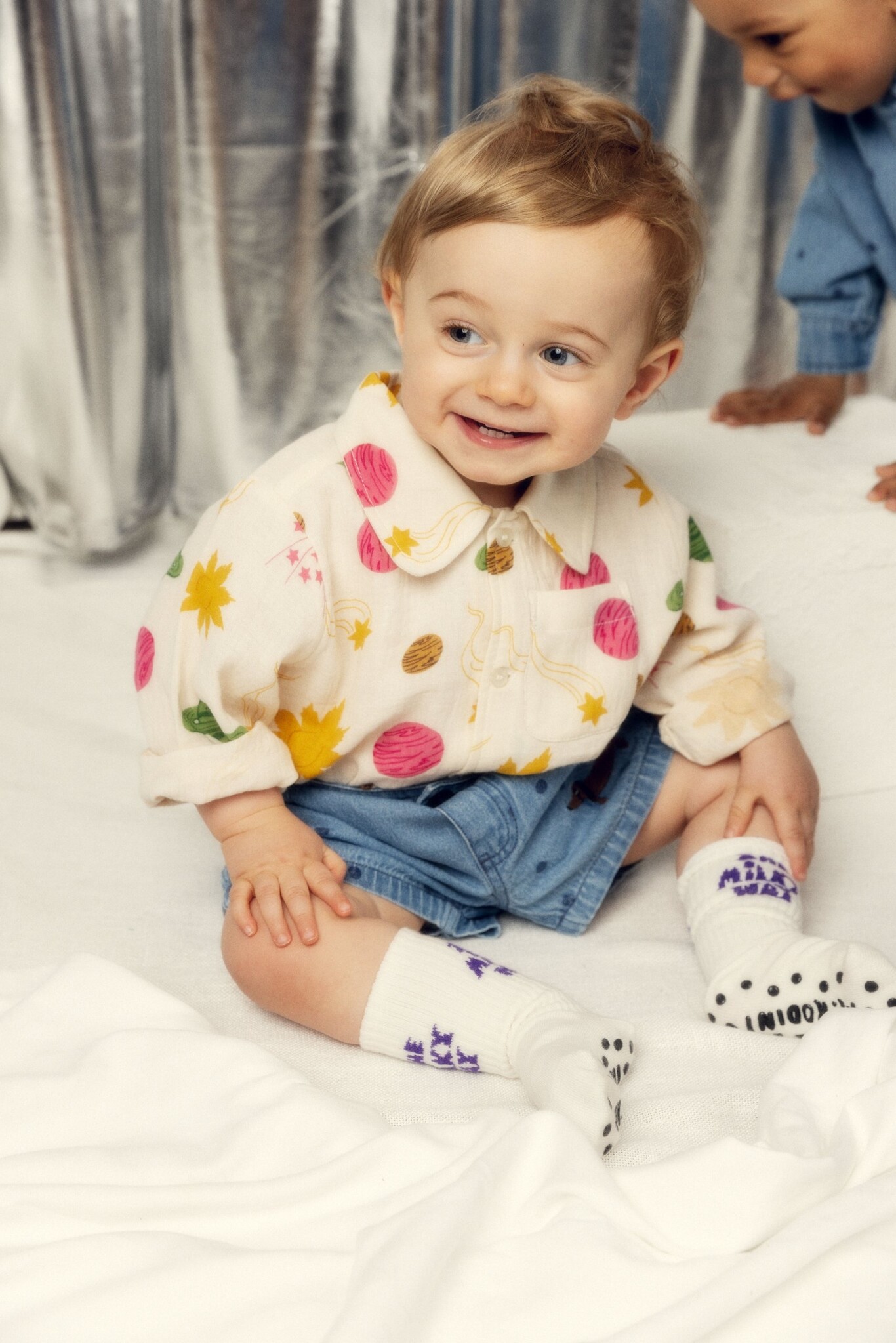 Zomerse blouse van Mini Rodini in een luchtige muslin stof. De top is uitgevoerd met korte pofmouwen en een all-over space print. Hij heeft een kraagje, knoopjes van boven tot onder en is gemaakt van organic cototn. Het merk valt redelijk normaal tot wat groter, zie onderaan de pagina voor een overzicht van de maten.