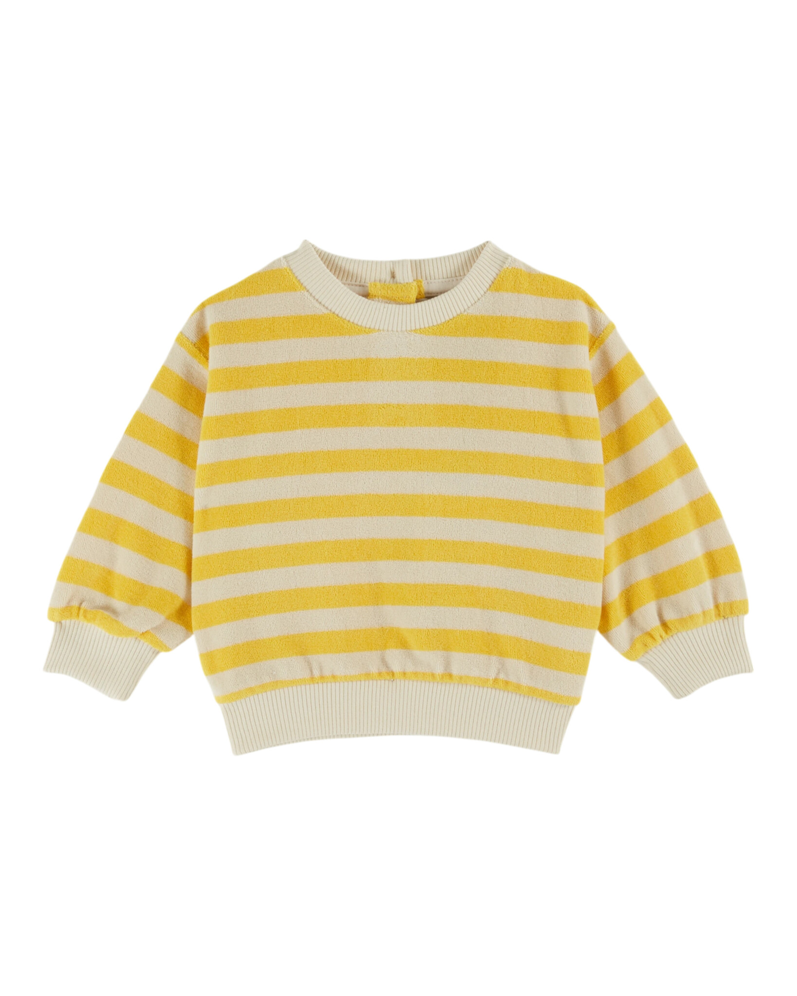 Zachte badstof sweater van Emile et ida in een gele streep. Het zachte truitje heeft een ronde hals en geribbelde boorden. Hij heeft een drukknoop sluiting aan de achterkant voor de baby maatjes. Lees meer